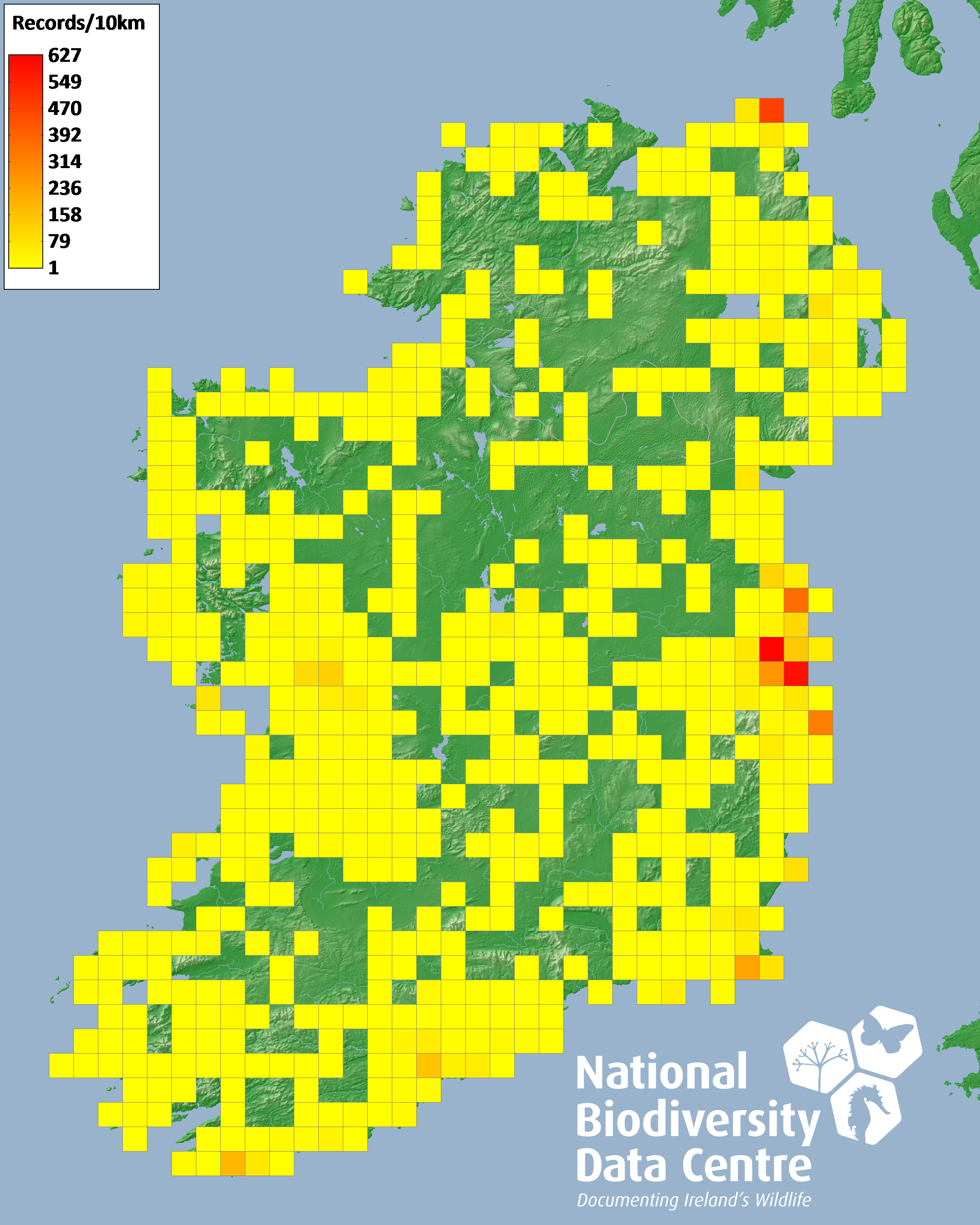 Distribution of the number of records recorded within each 10km grid square (ITM).Marine Map - 50km