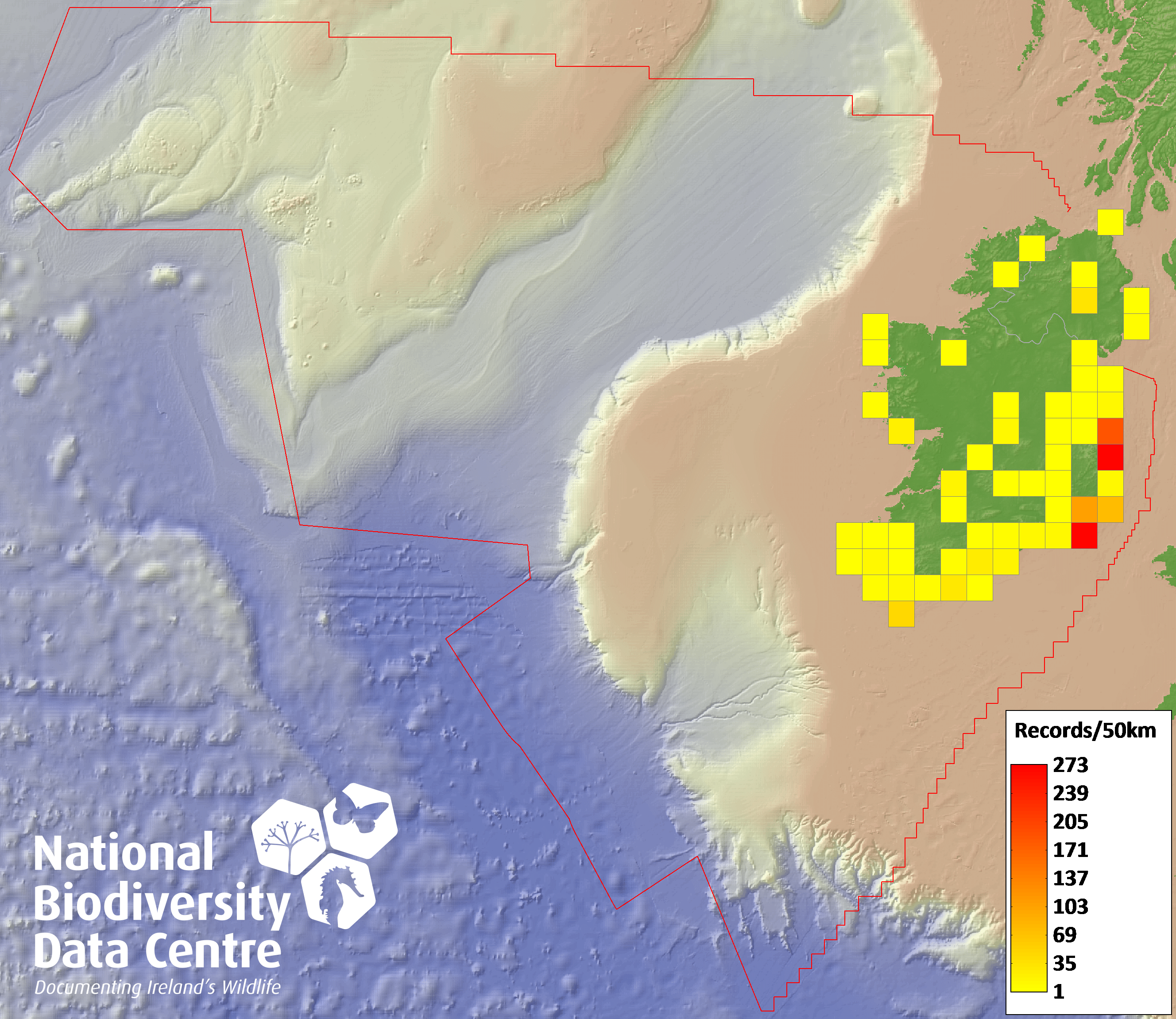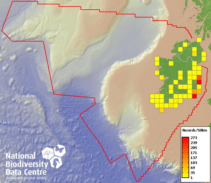 Distribution of the number of records recorded within each 10km grid square (ITM).Marine Map - 50km