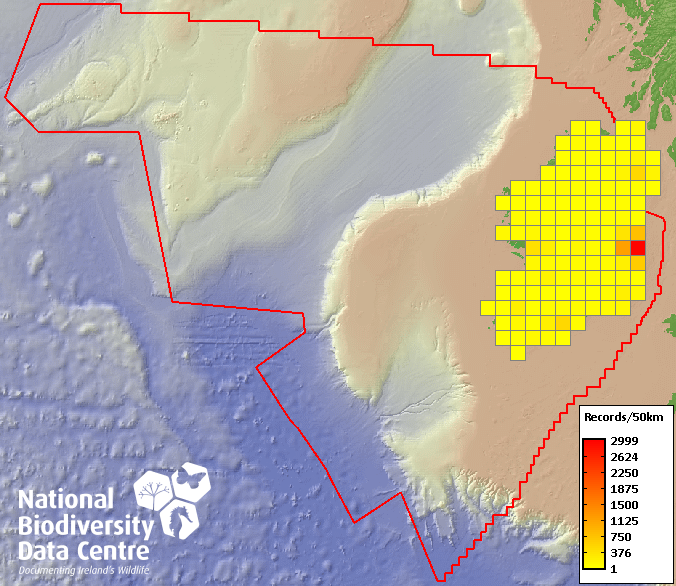 Distribution of the number of records recorded within each 10km grid square (ITM).Marine Map - 50km