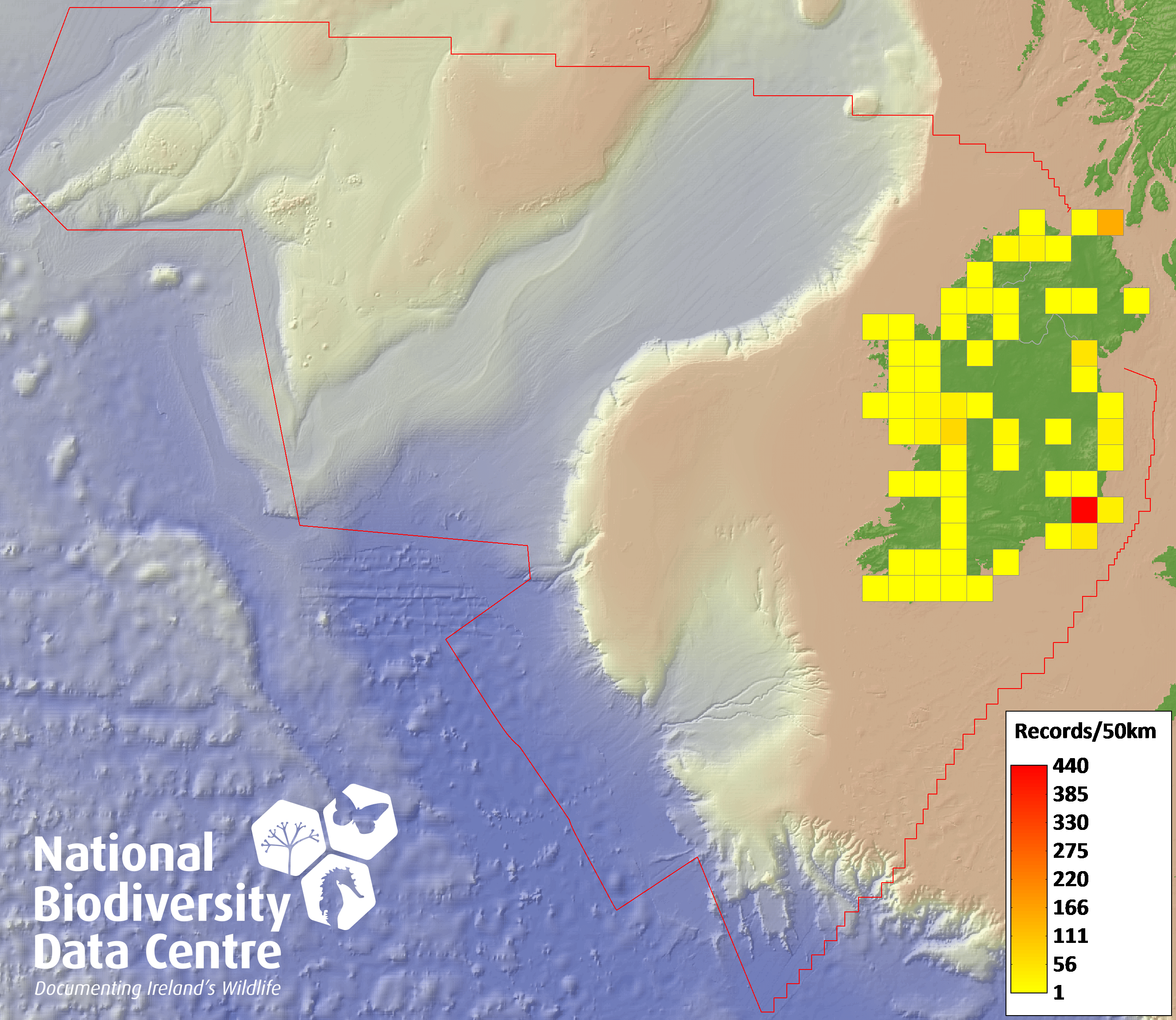 Distribution of the number of records recorded within each 10km grid square (ITM).Marine Map - 50km