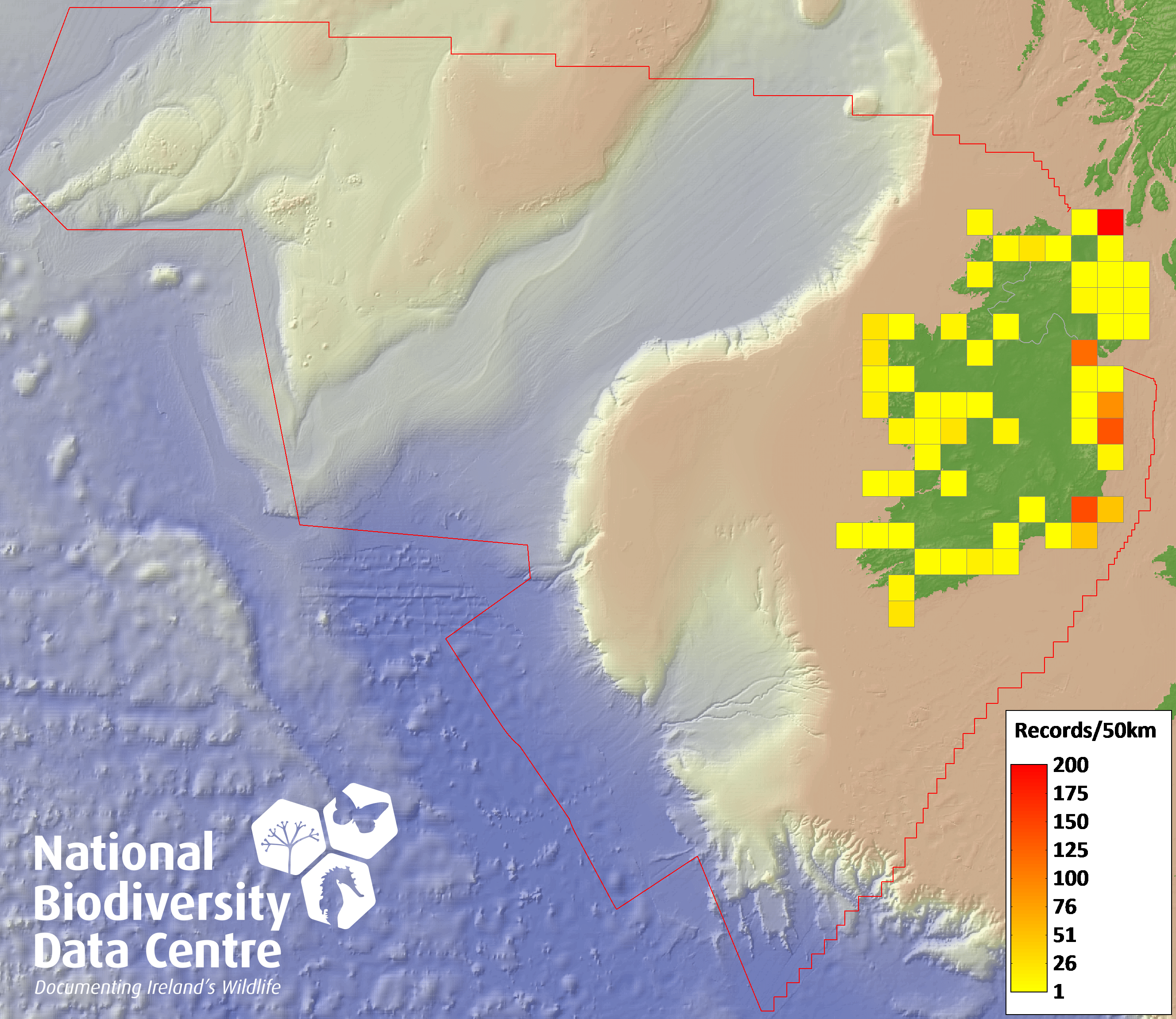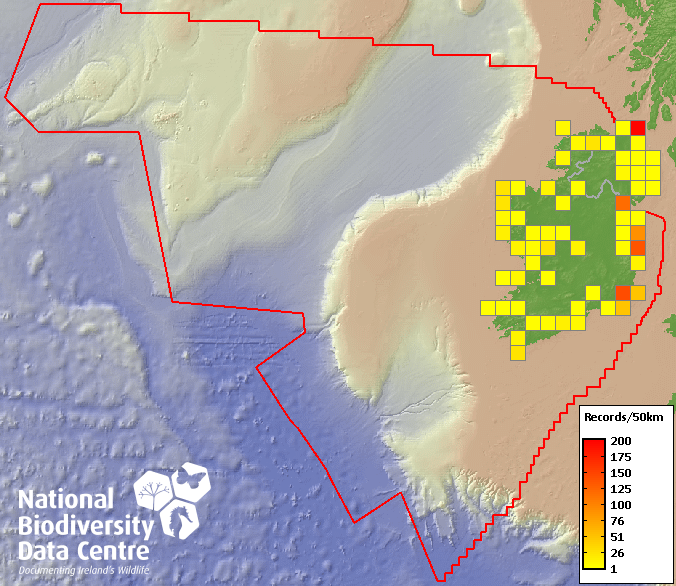 Distribution of the number of records recorded within each 10km grid square (ITM).Marine Map - 50km