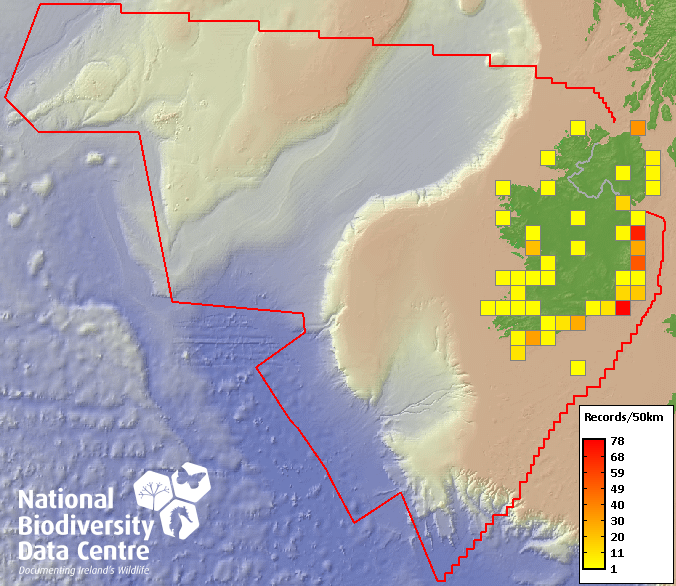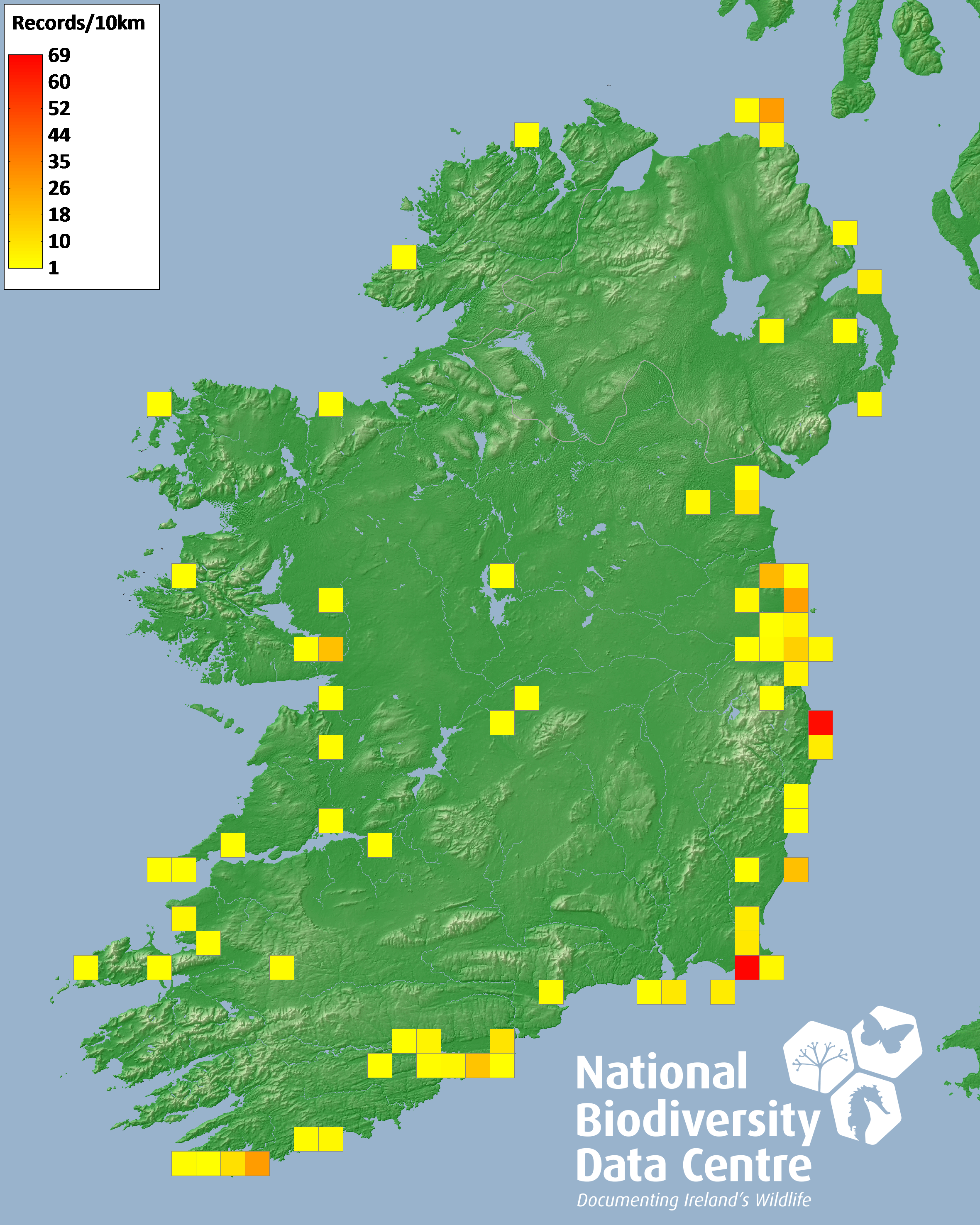 Distribution of the number of records recorded within each 10km grid square (ITM).Marine Map - 50km