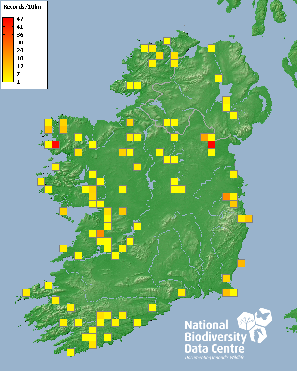 Distribution of the number of records recorded within each 10km grid square (ITM).Marine Map - 50km