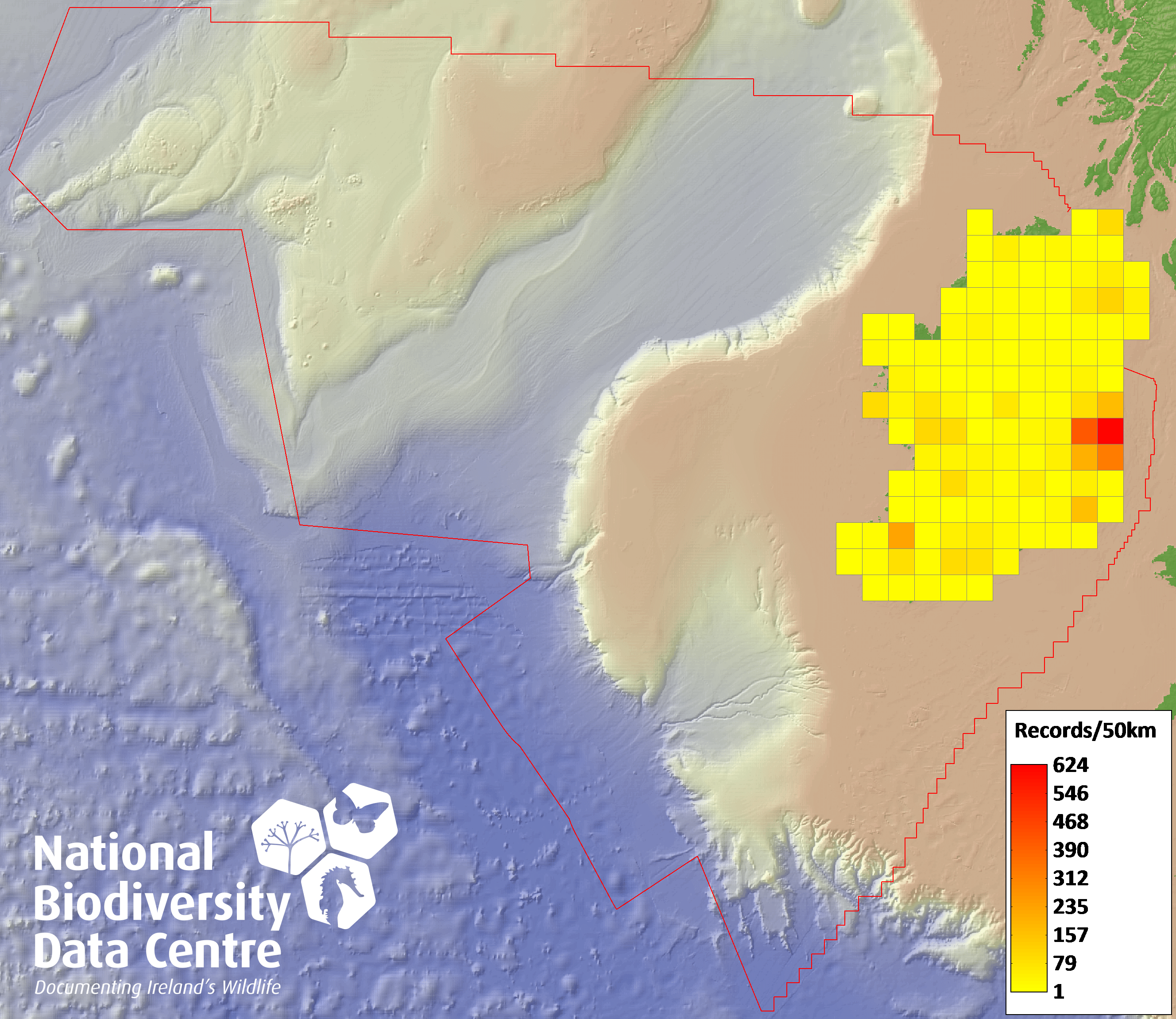 Distribution of the number of records recorded within each 10km grid square (ITM).Marine Map - 50km