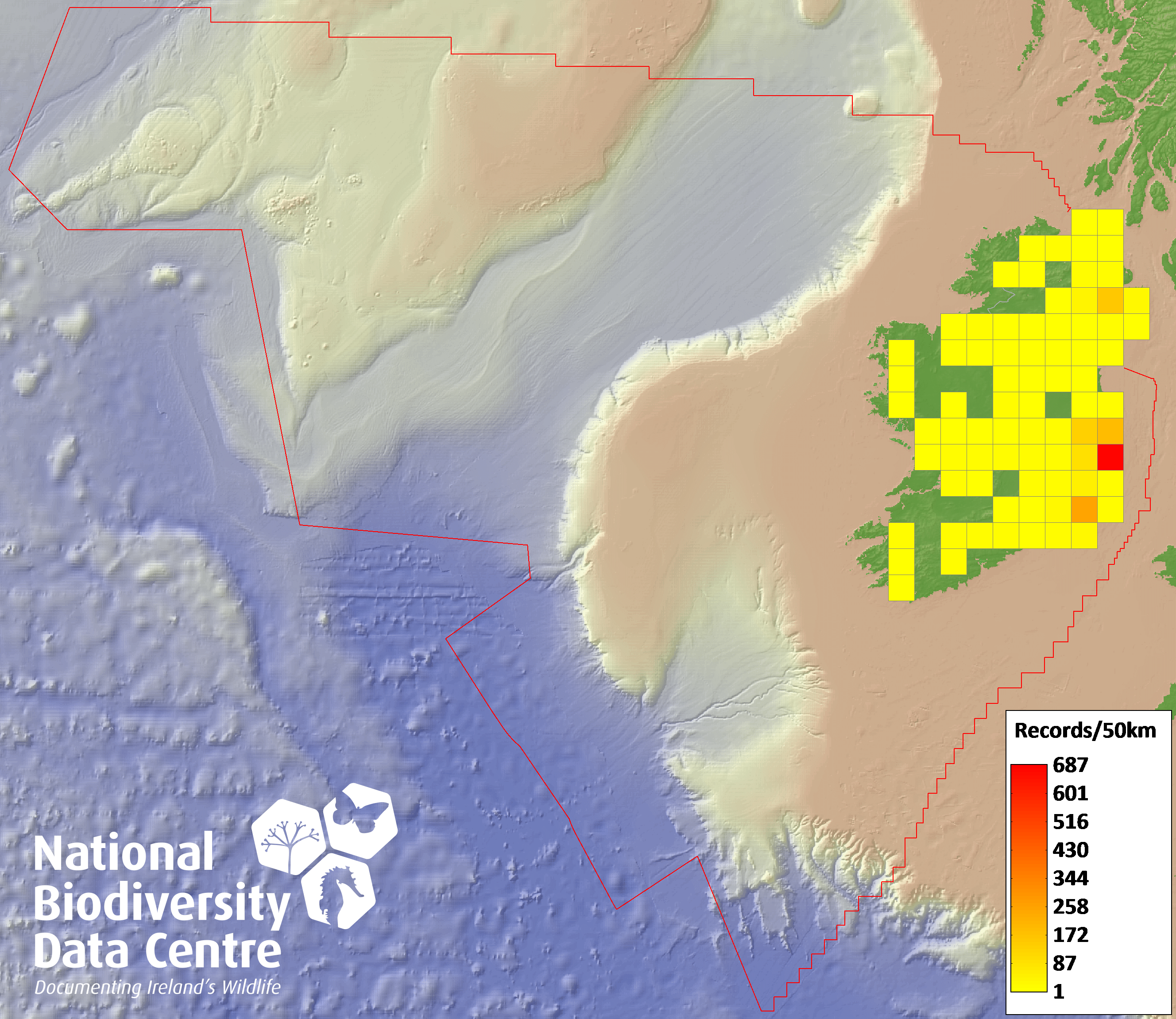 Distribution of the number of records recorded within each 10km grid square (ITM).Marine Map - 50km