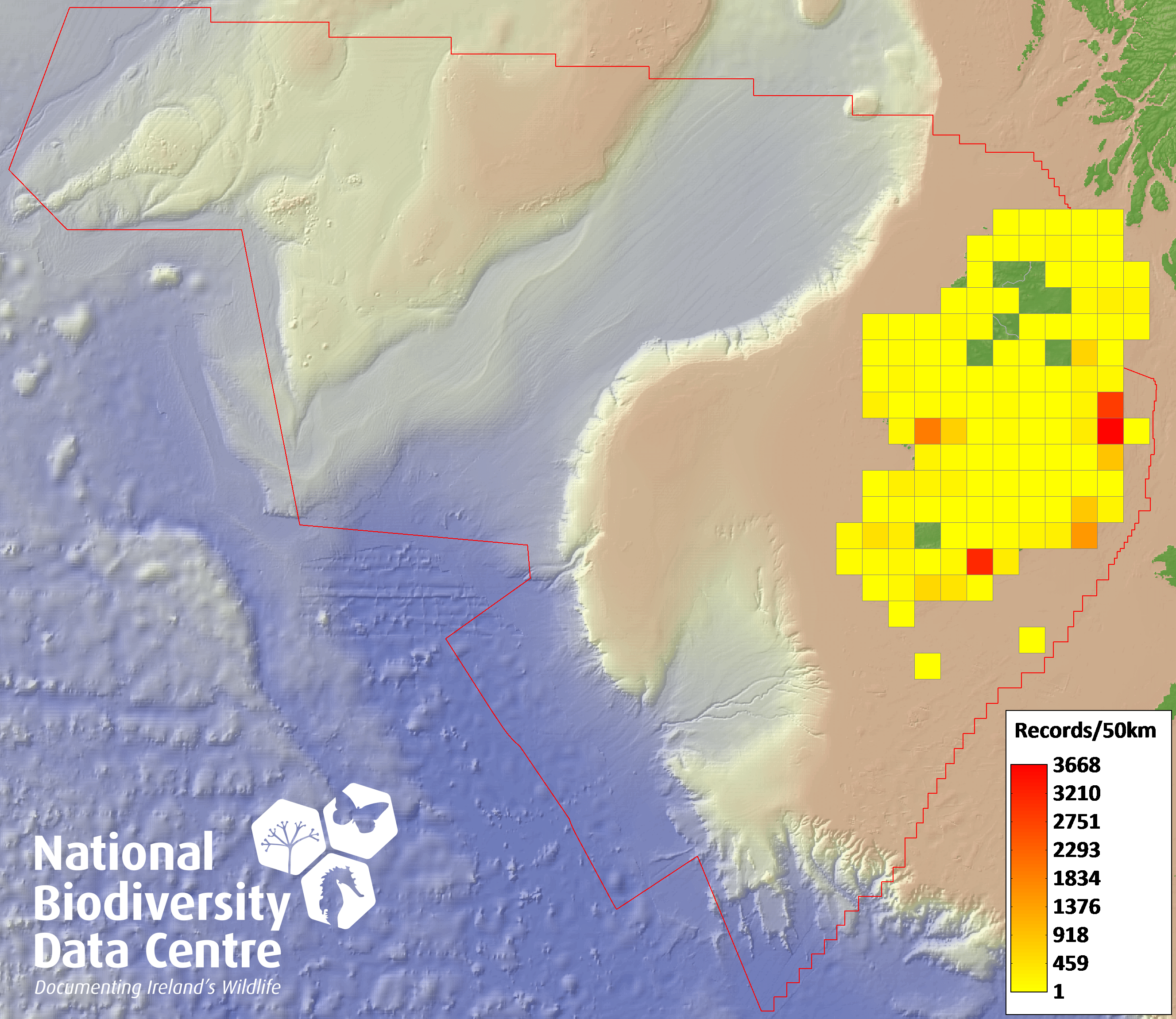Distribution of the number of records recorded within each 10km grid square (ITM).Marine Map - 50km