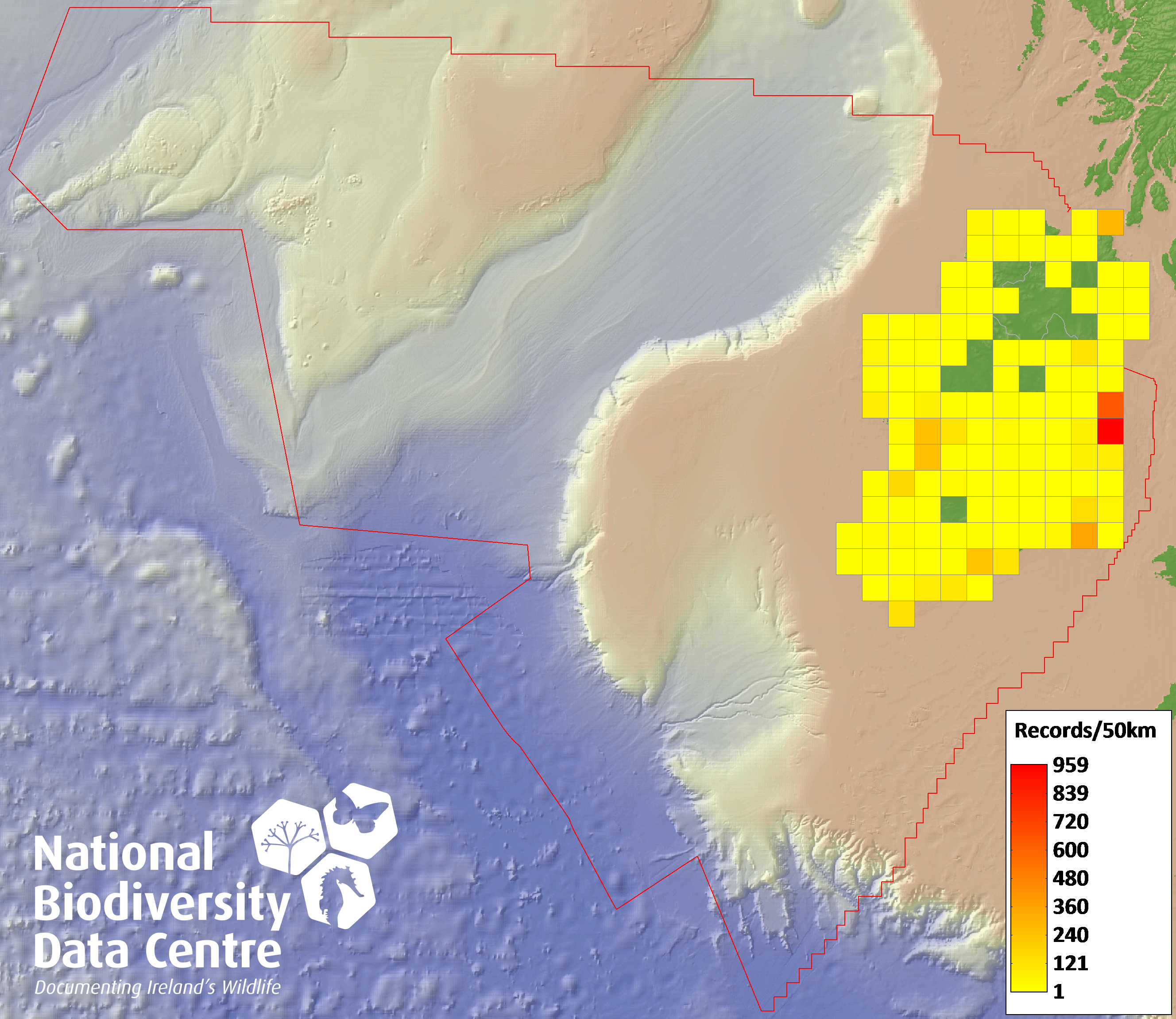 Distribution of the number of records recorded within each 10km grid square (ITM).Marine Map - 50km