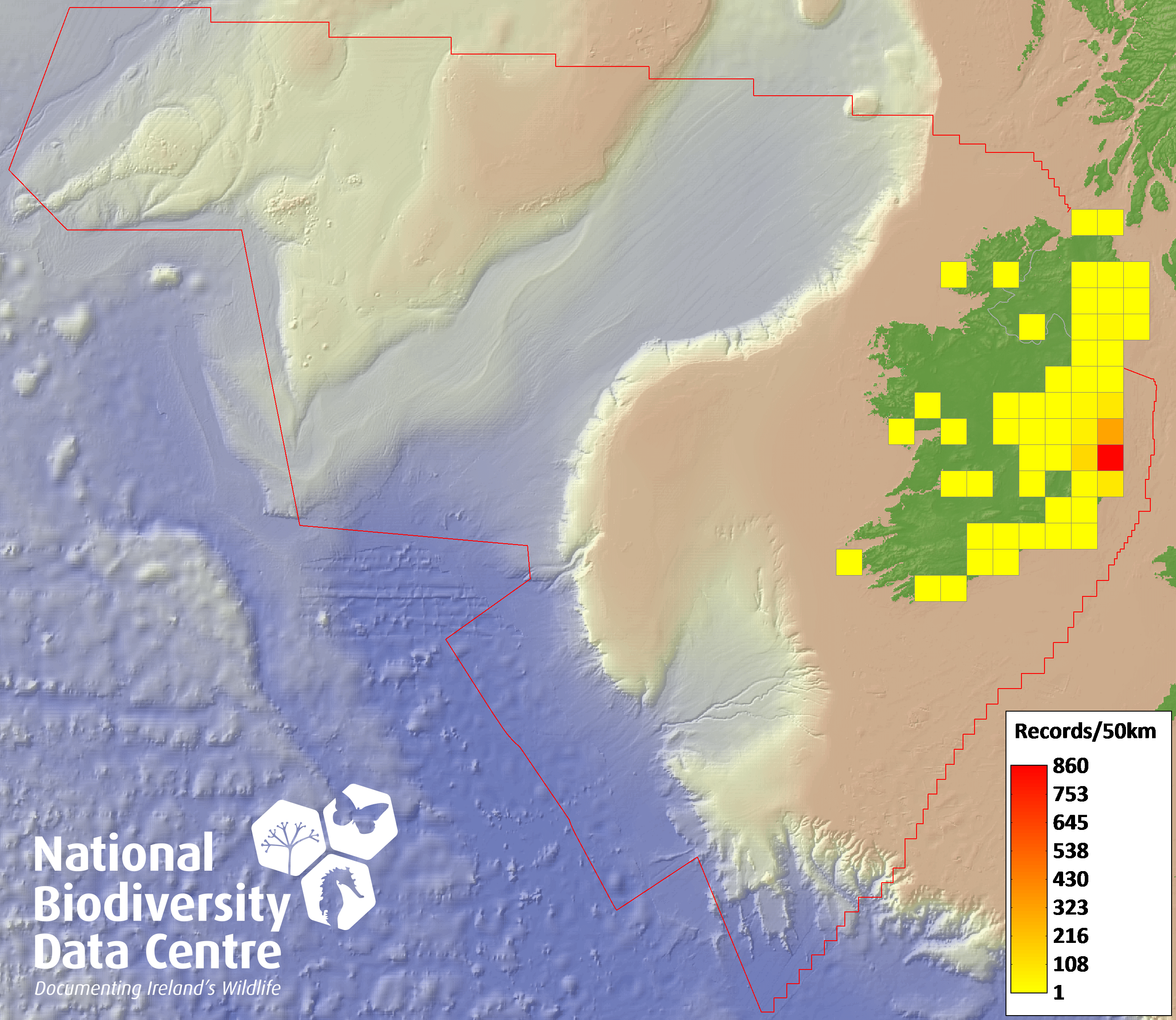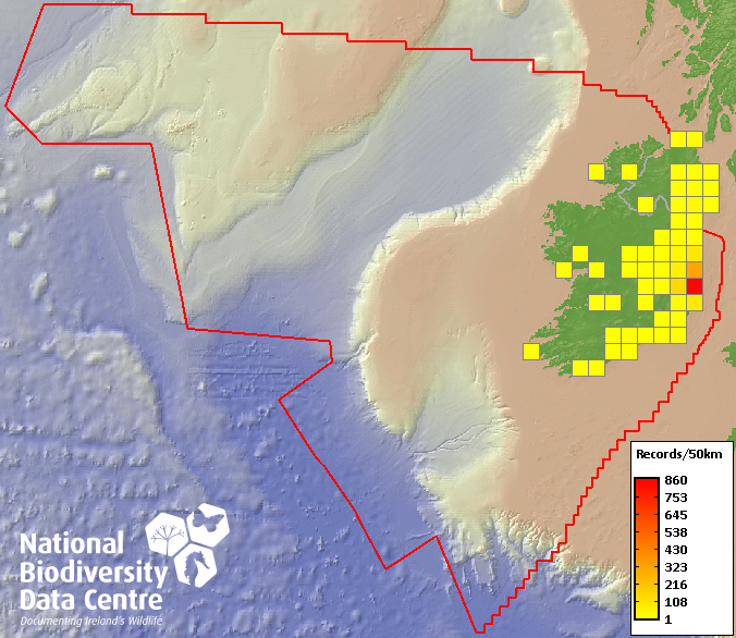 Distribution of the number of records recorded within each 10km grid square (ITM).Marine Map - 50km