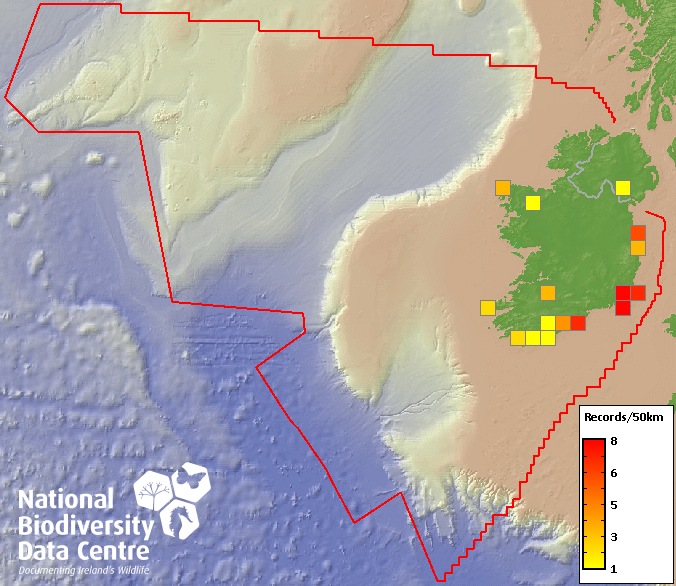 Distribution of the number of records recorded within each 10km grid square (ITM).Marine Map - 50km