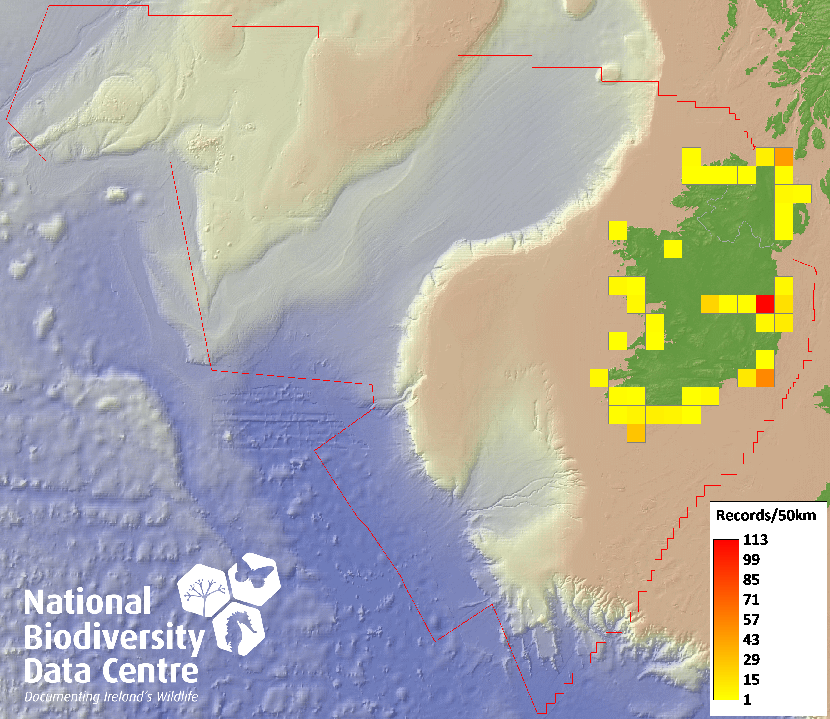 Distribution of the number of records recorded within each 10km grid square (ITM).Marine Map - 50km