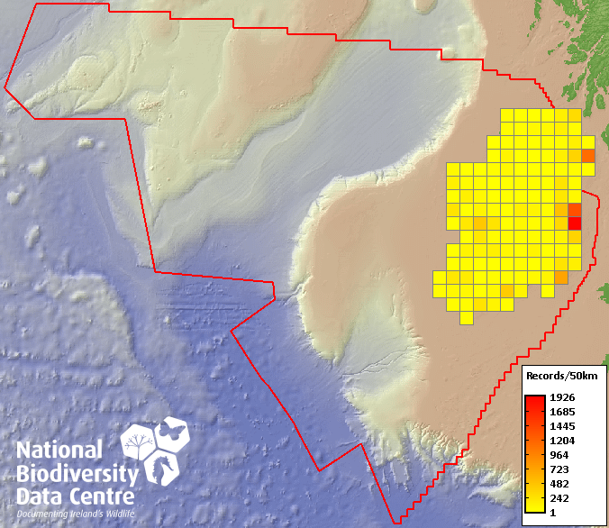Distribution of the number of records recorded within each 10km grid square (ITM).Marine Map - 50km