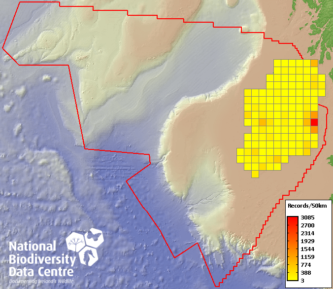 Distribution of the number of records recorded within each 10km grid square (ITM).Marine Map - 50km