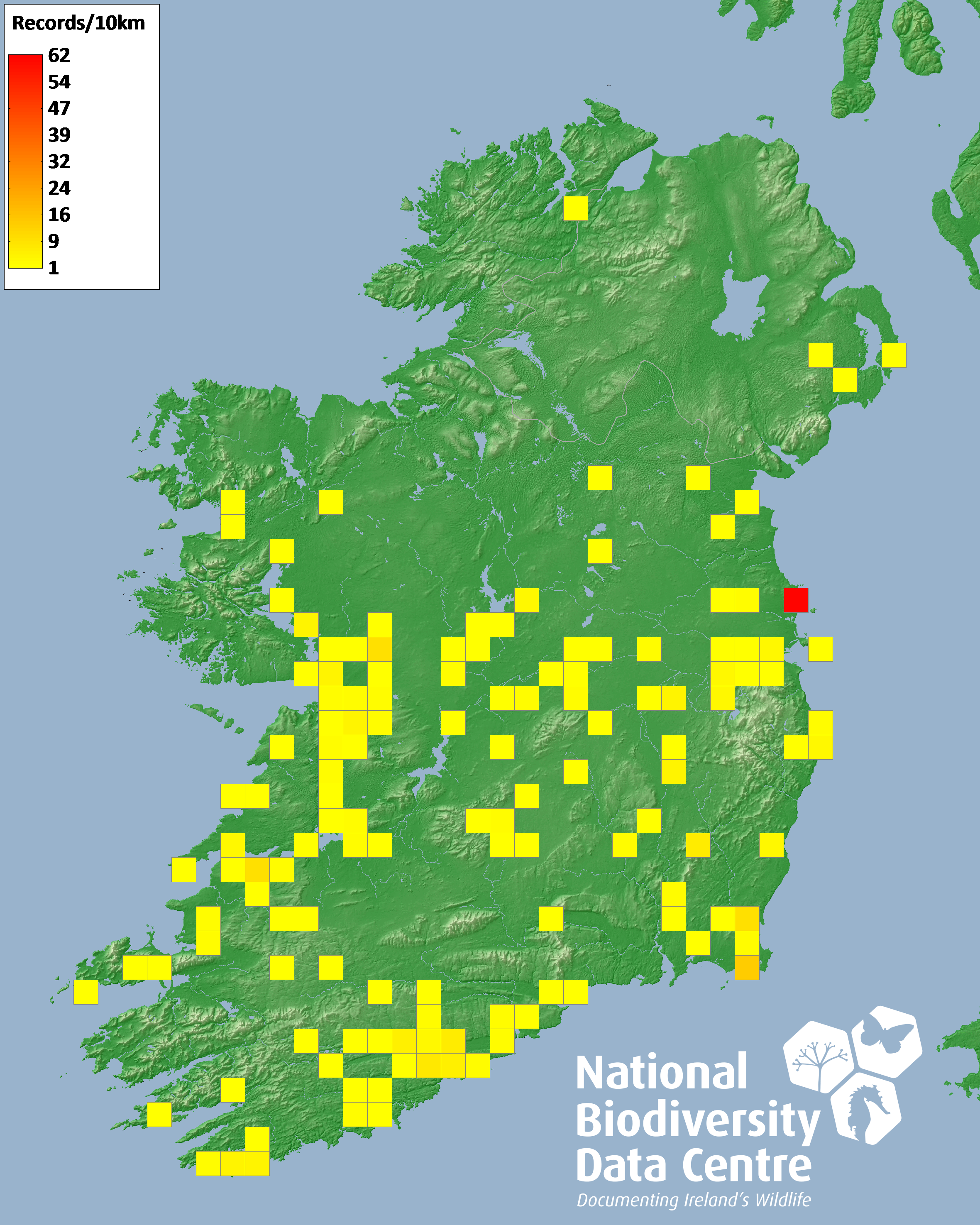 Distribution of the number of records recorded within each 10km grid square (ITM).Marine Map - 50km