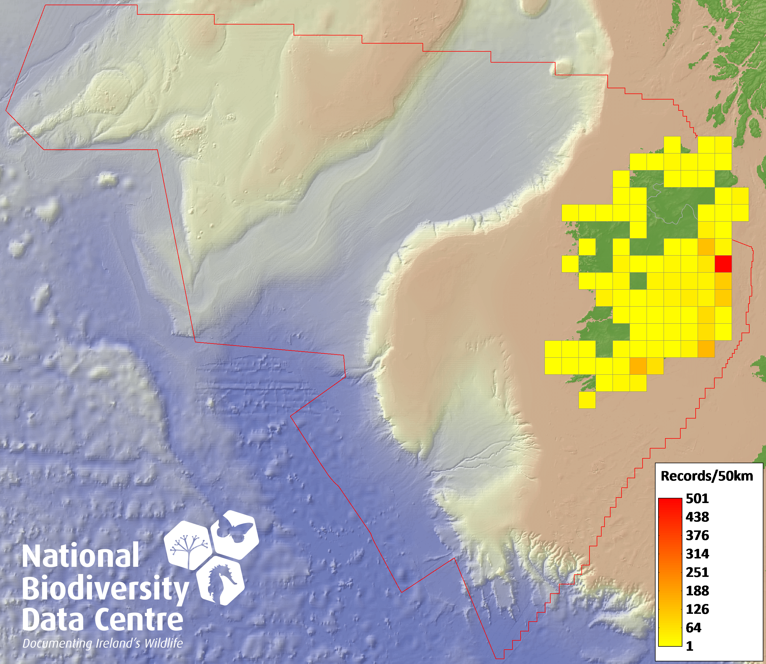 Distribution of the number of records recorded within each 10km grid square (ITM).Marine Map - 50km