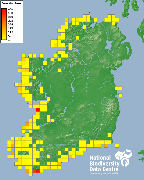 Distribution of the number of records recorded within each 10km grid square (ITM).Marine Map - 50km