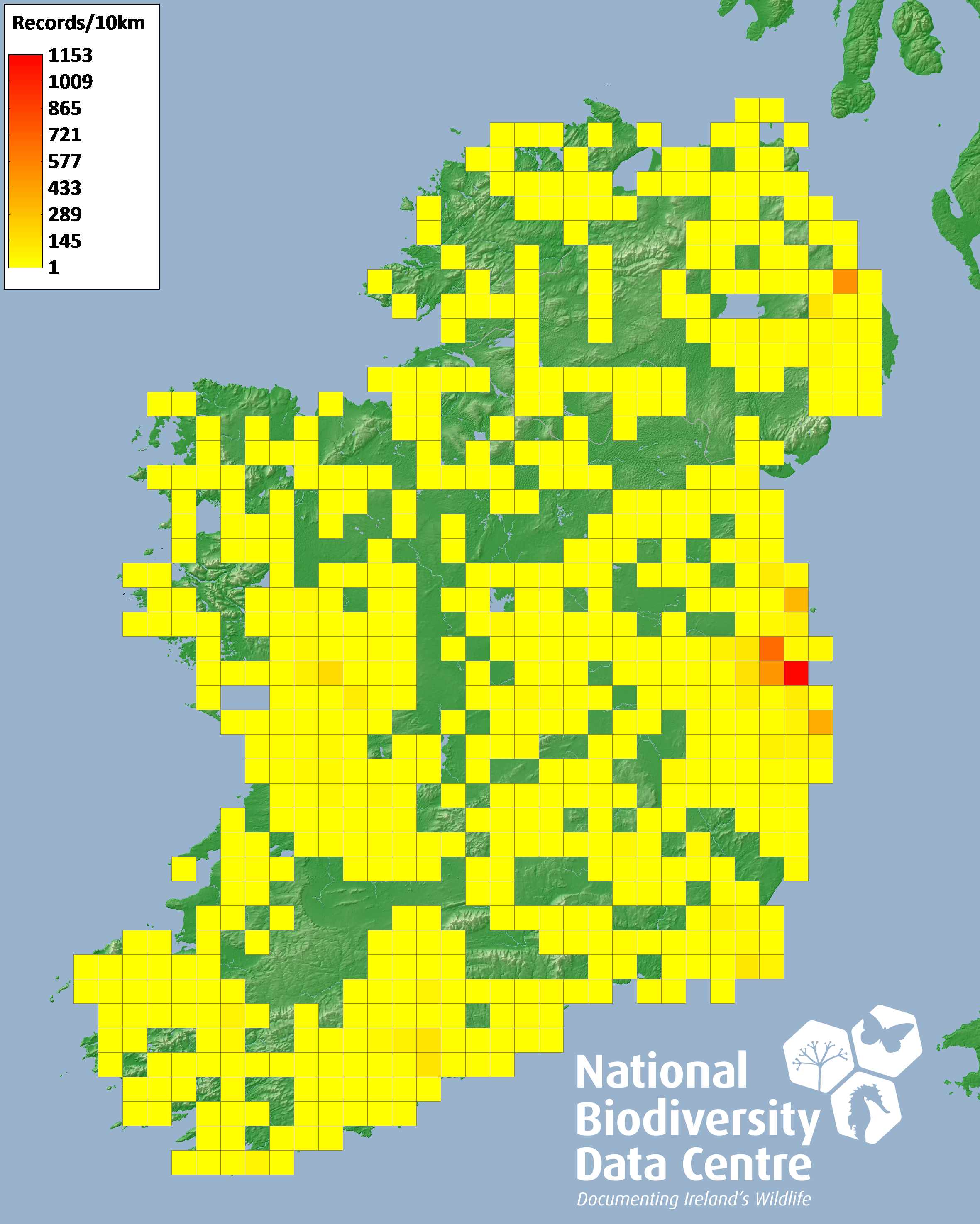 Distribution of the number of records recorded within each 10km grid square (ITM).Marine Map - 50km