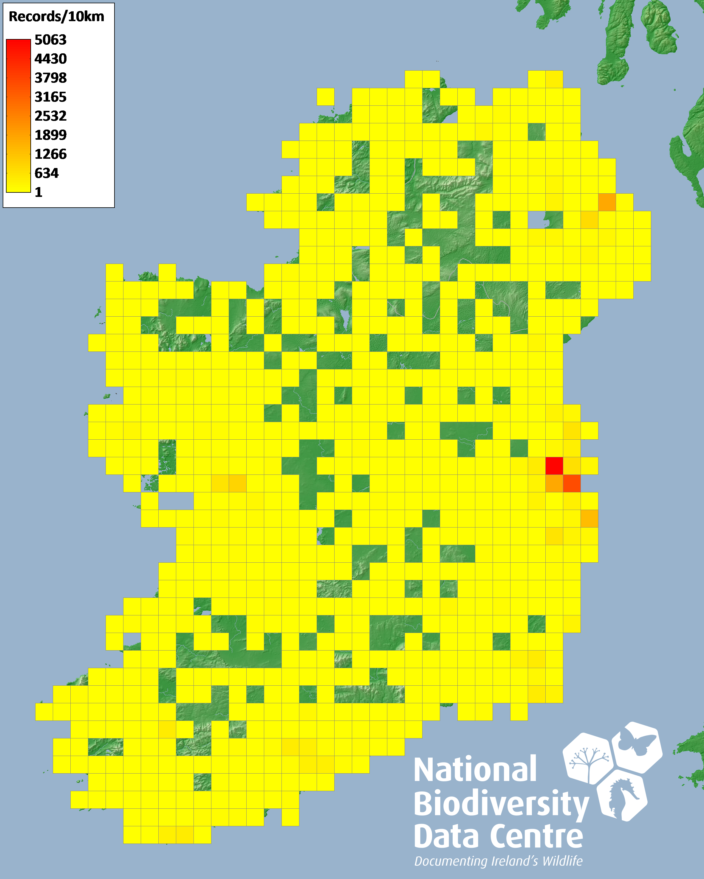 Distribution of the number of records recorded within each 10km grid square (ITM).Marine Map - 50km
