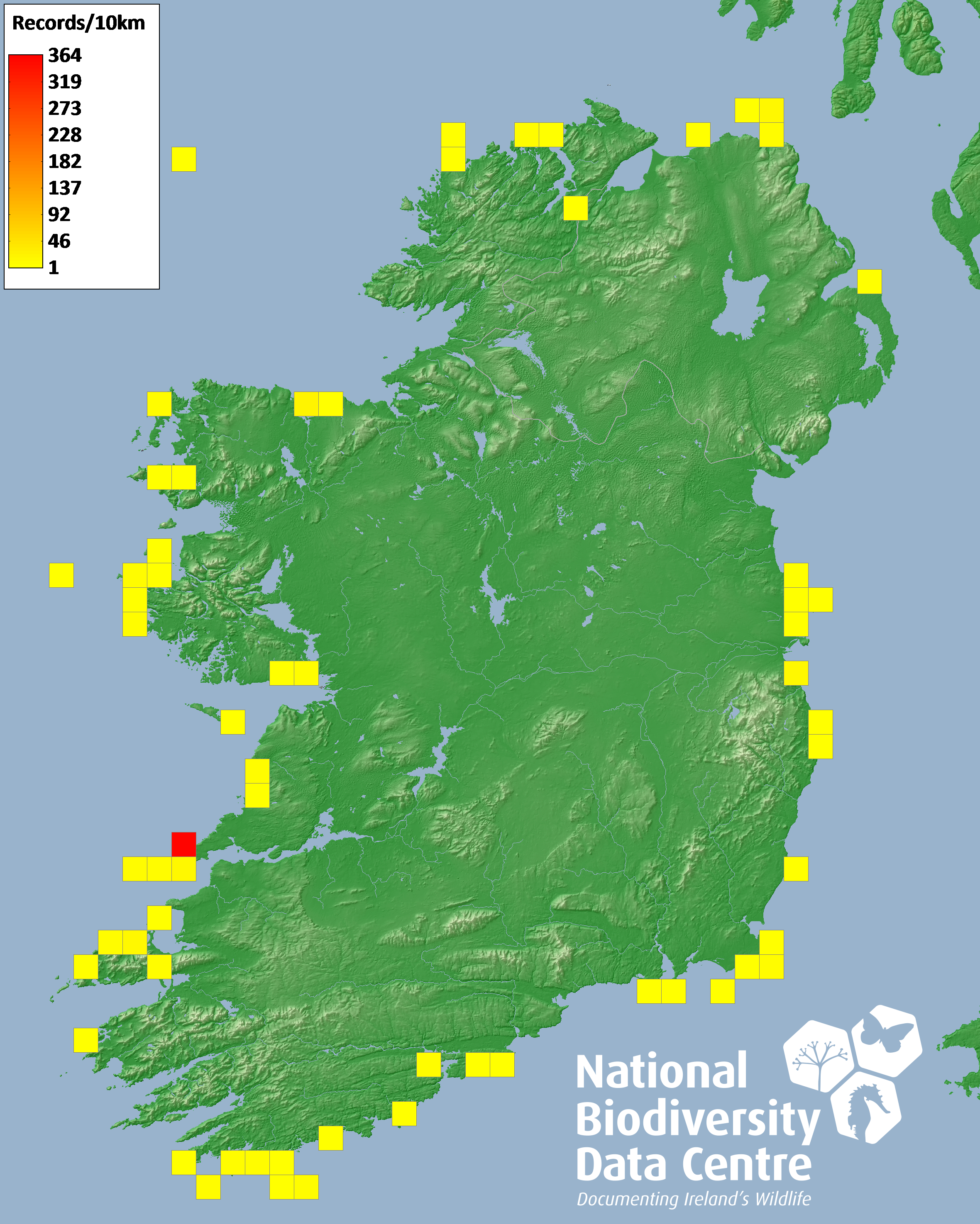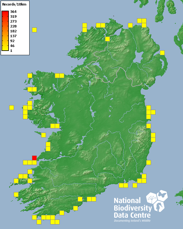 Distribution of the number of records recorded within each 10km grid square (ITM).Marine Map - 50km