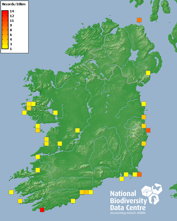 Distribution of the number of records recorded within each 10km grid square (ITM).Marine Map - 50km