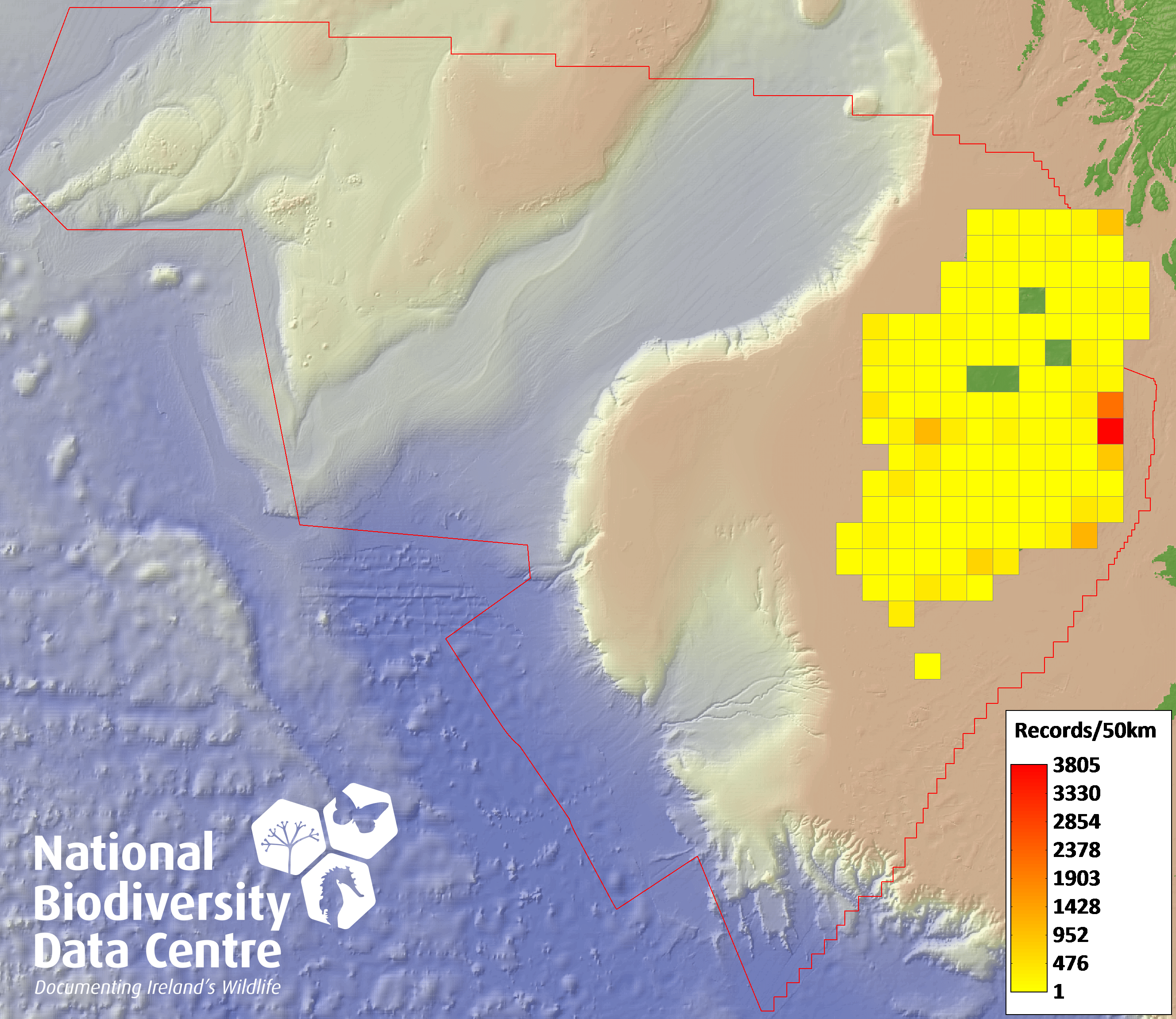 Distribution of the number of records recorded within each 10km grid square (ITM).Marine Map - 50km