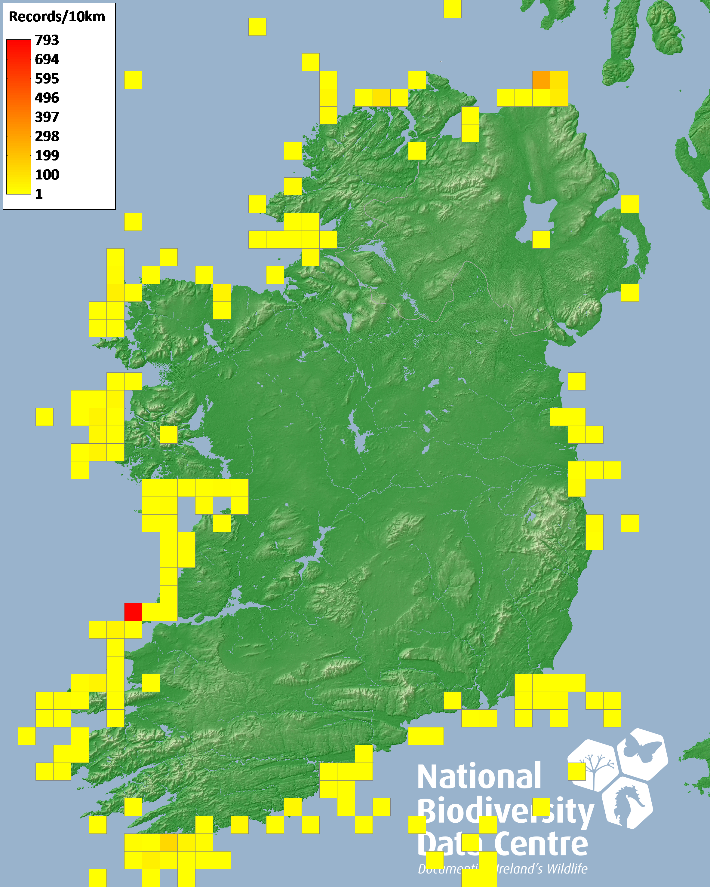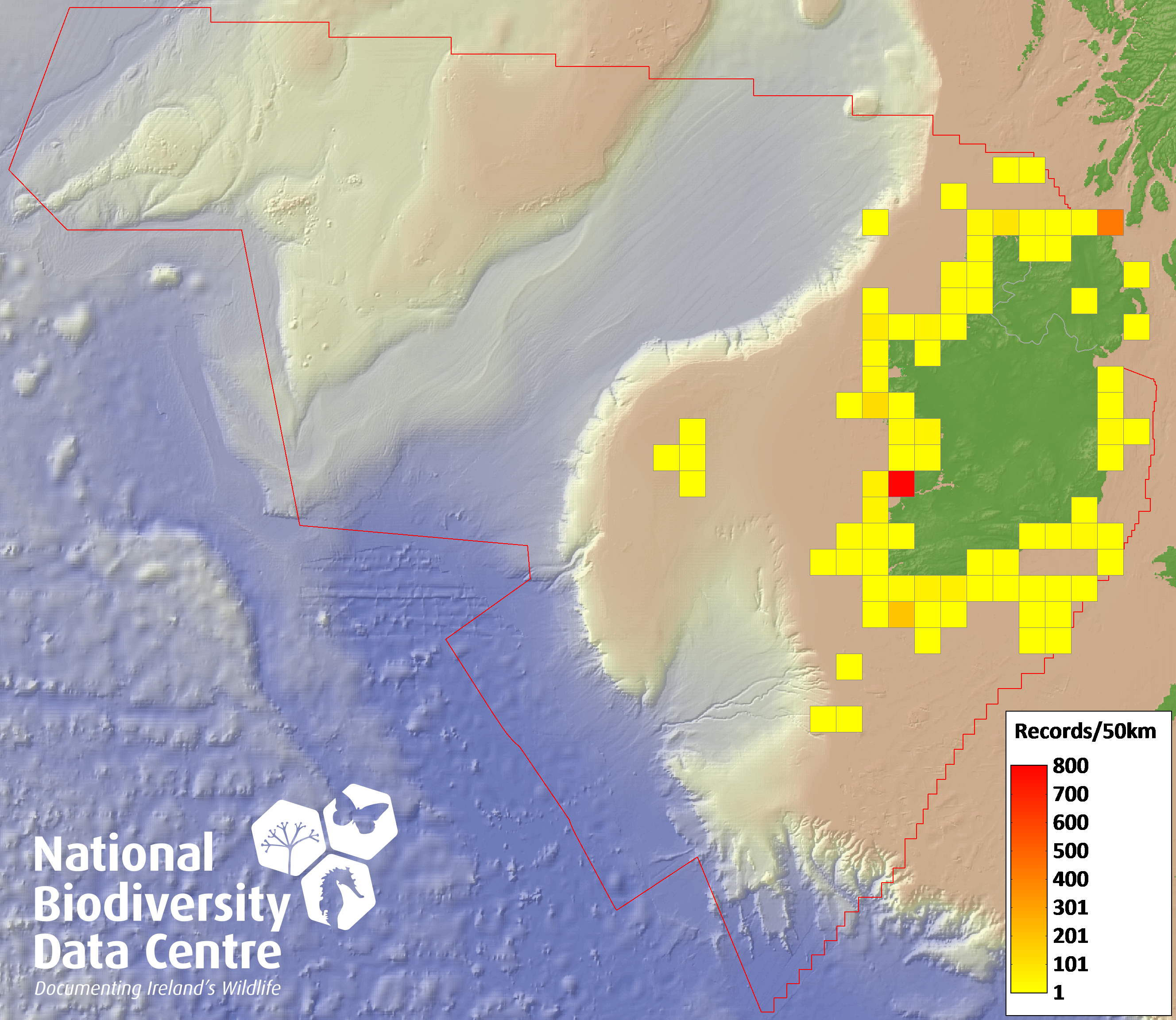Distribution of the number of records recorded within each 10km grid square (ITM).Marine Map - 50km