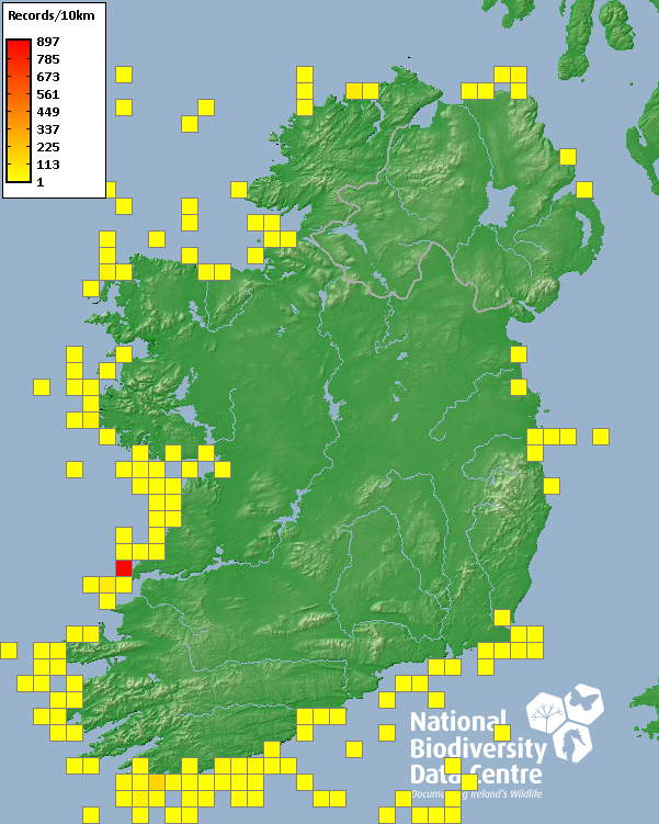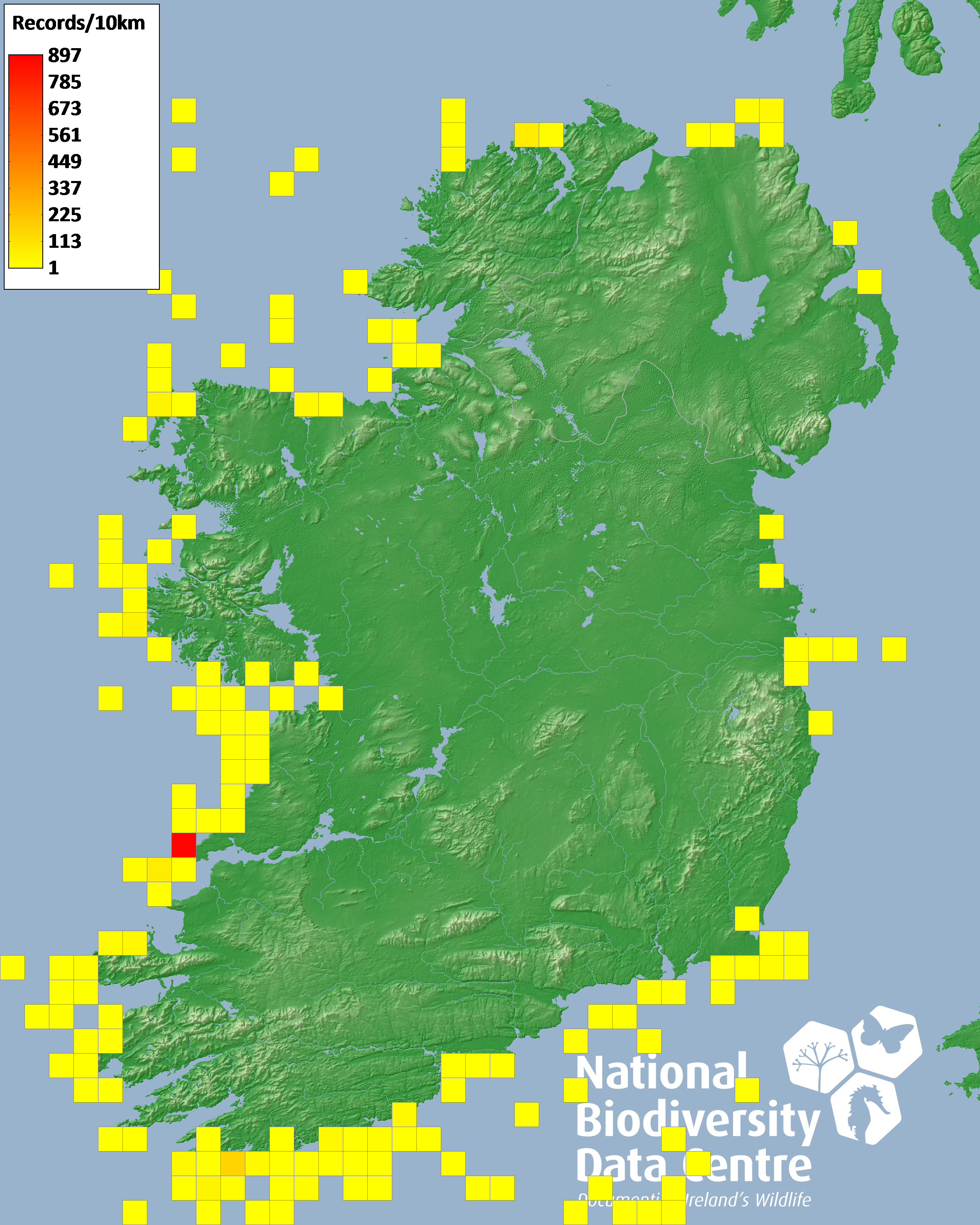 Distribution of the number of records recorded within each 10km grid square (ITM).Marine Map - 50km