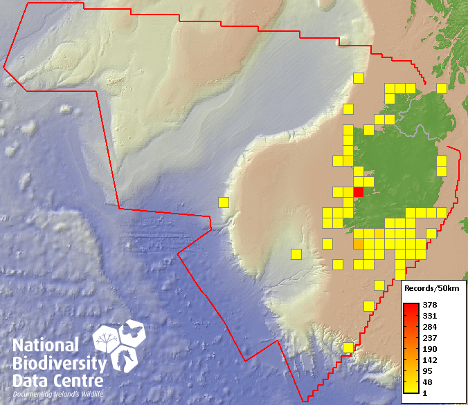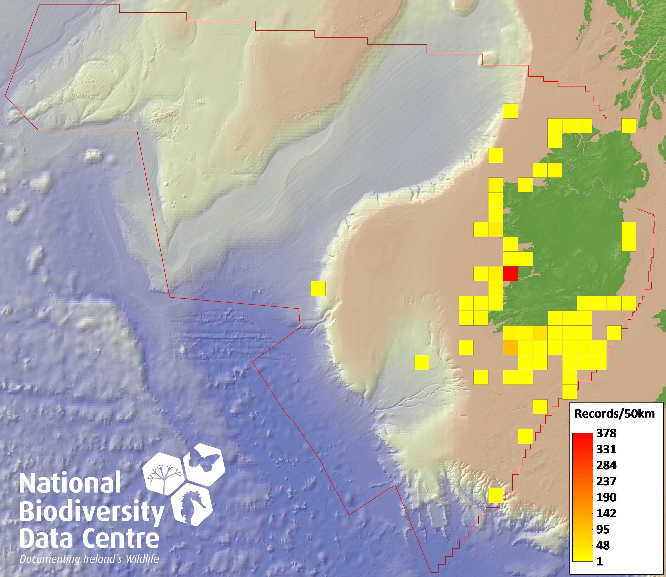 Distribution of the number of records recorded within each 10km grid square (ITM).Marine Map - 50km