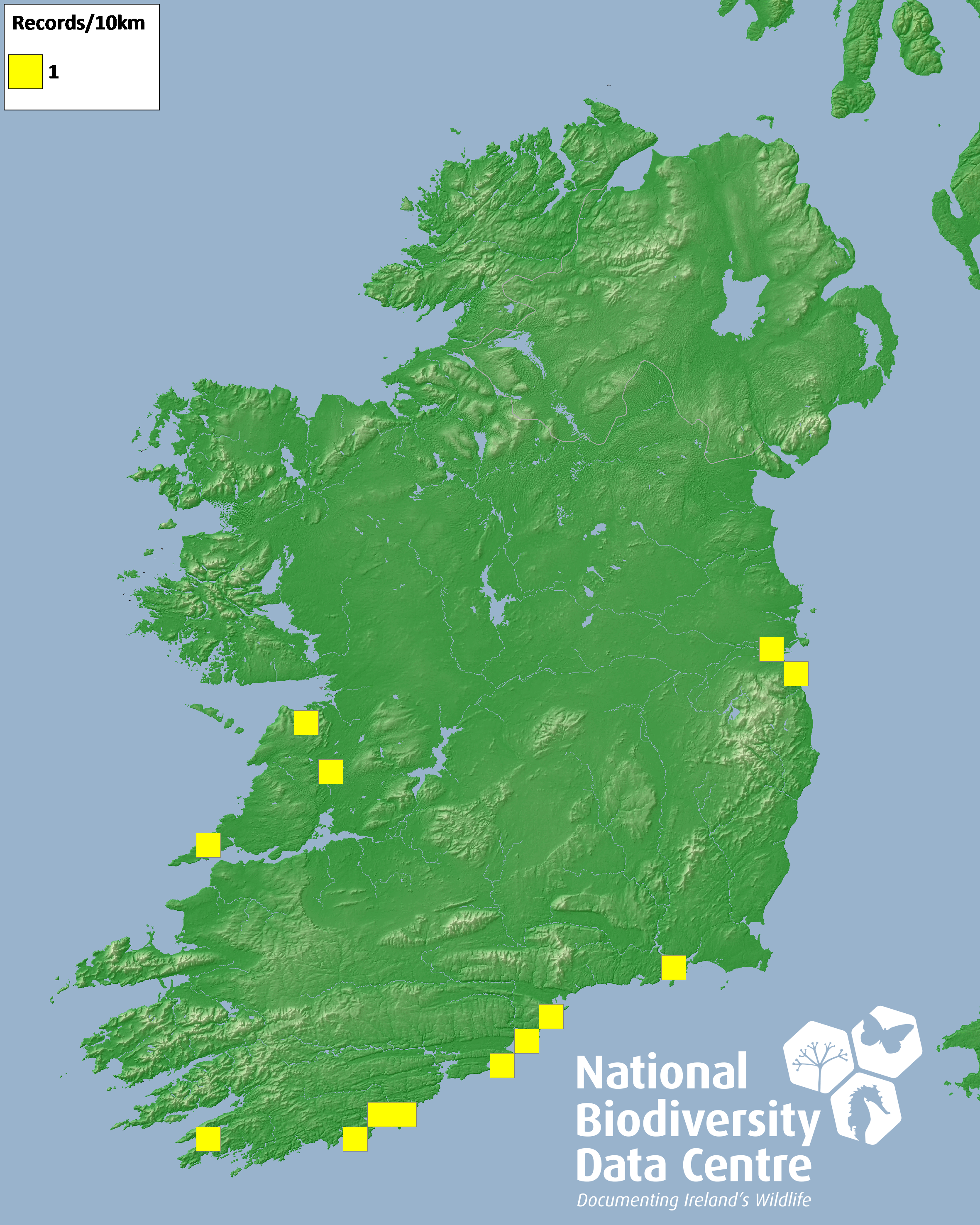 Distribution of the number of records recorded within each 10km grid square (ITM).Marine Map - 50km