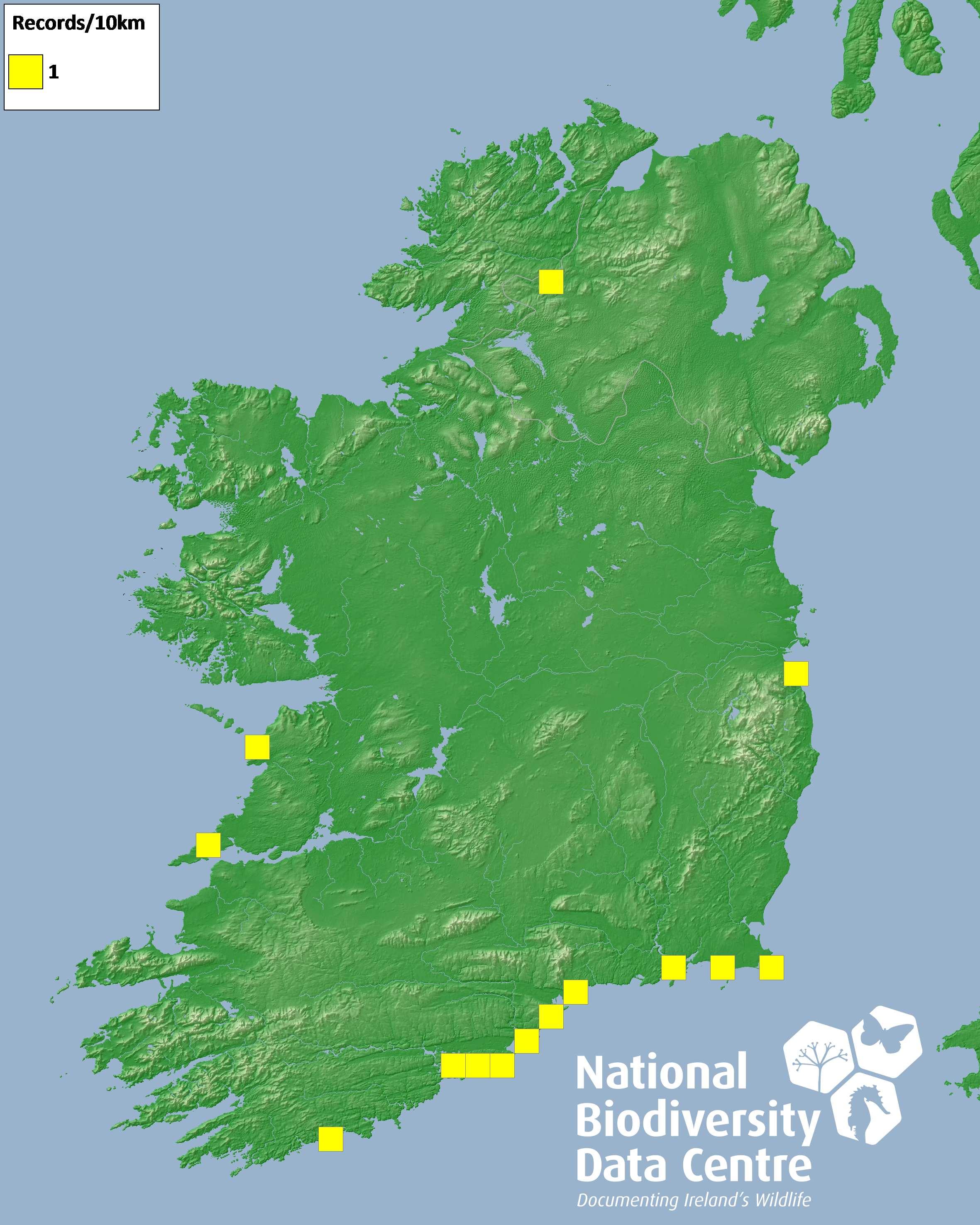Distribution of the number of records recorded within each 10km grid square (ITM).Marine Map - 50km