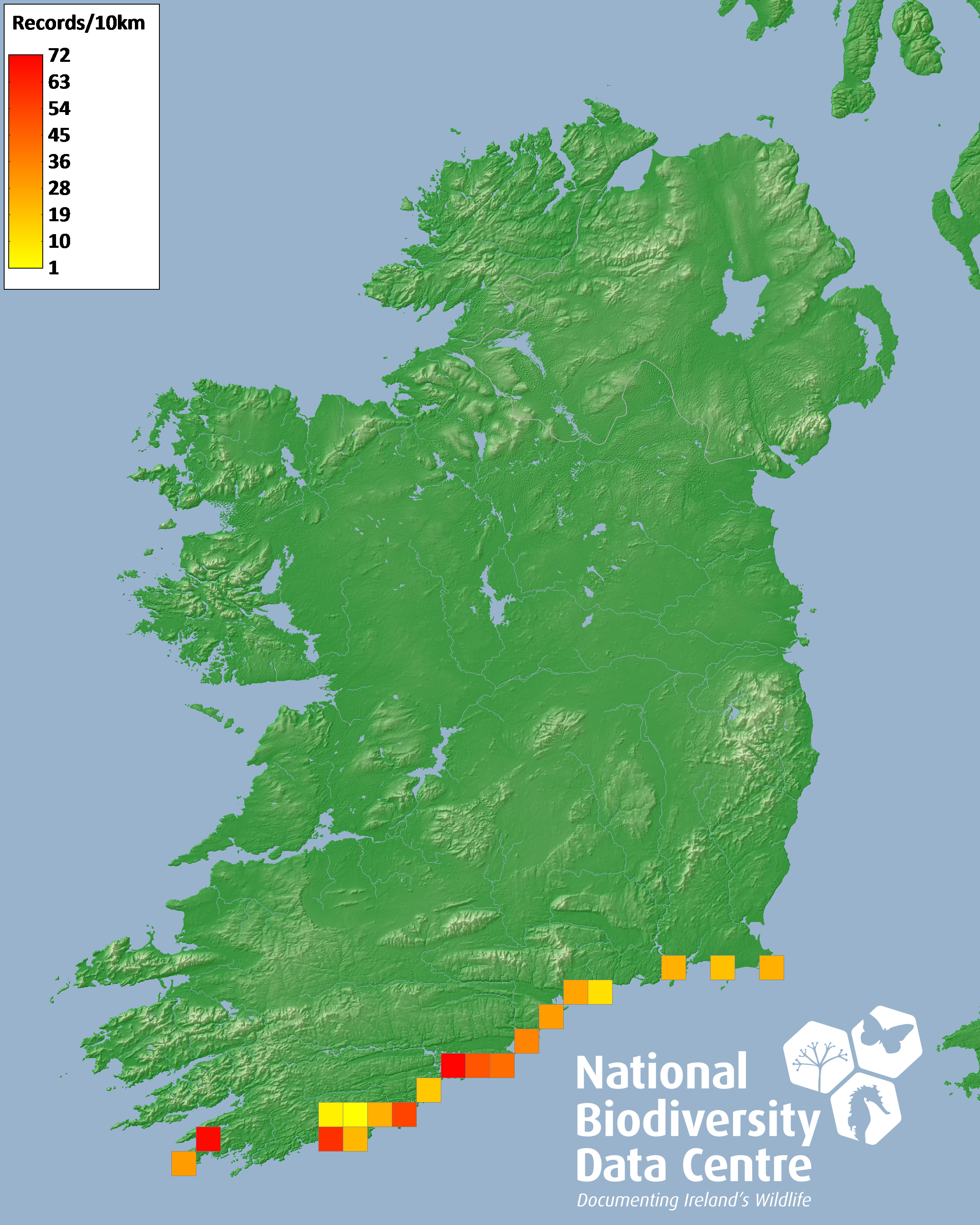 Distribution of the number of records within each 10km grid square (ITM).Marine Map - 50Km