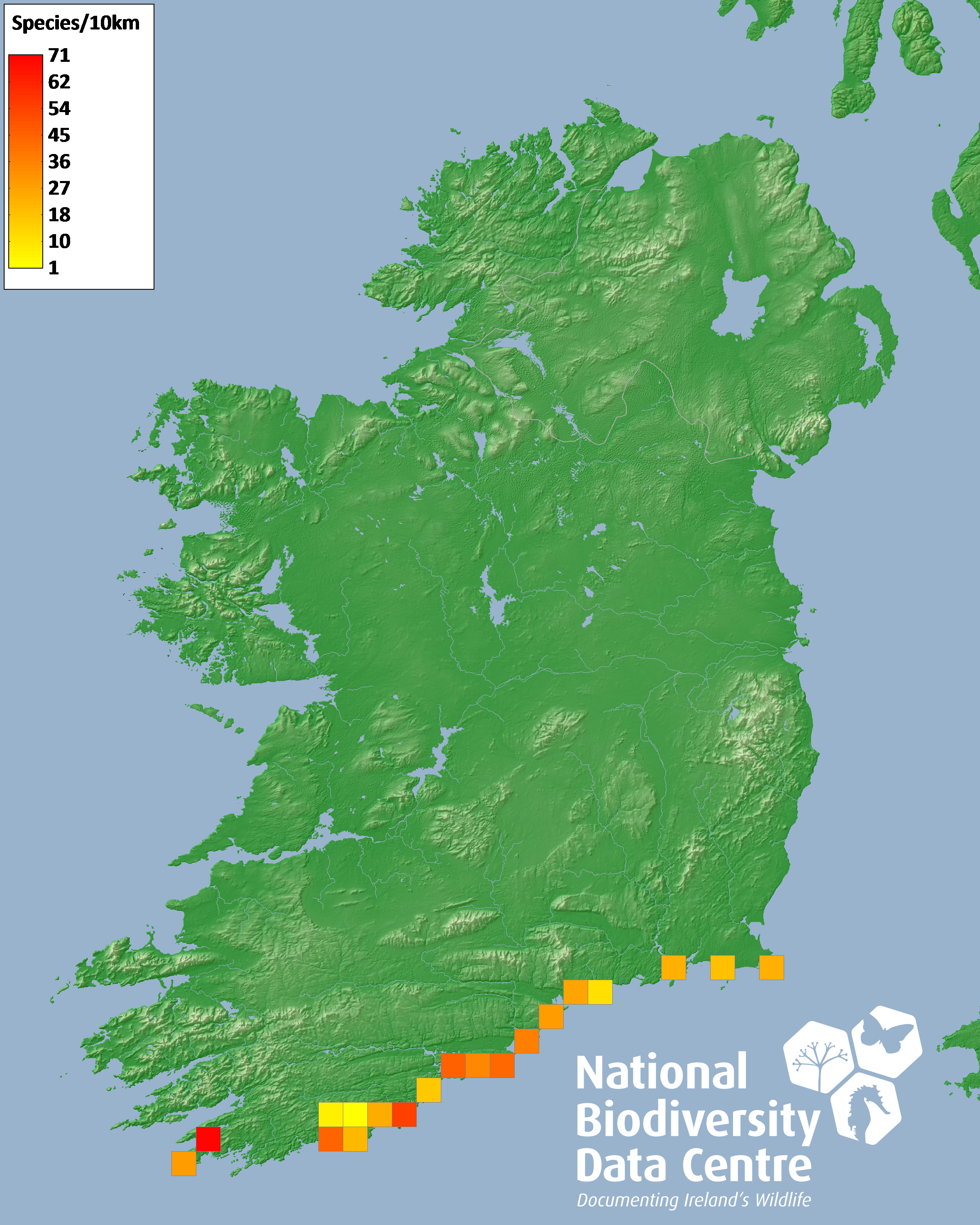 Distribution of the number of species recorded within each 10km grid square (ITM).Marine Map - 50Km