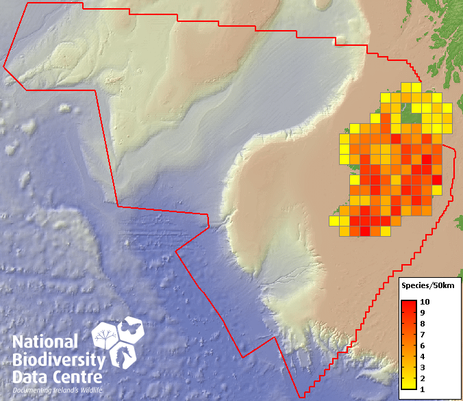 Distribution of the number of species recorded within each 10km grid square (ITM).Marine Map - 50Km