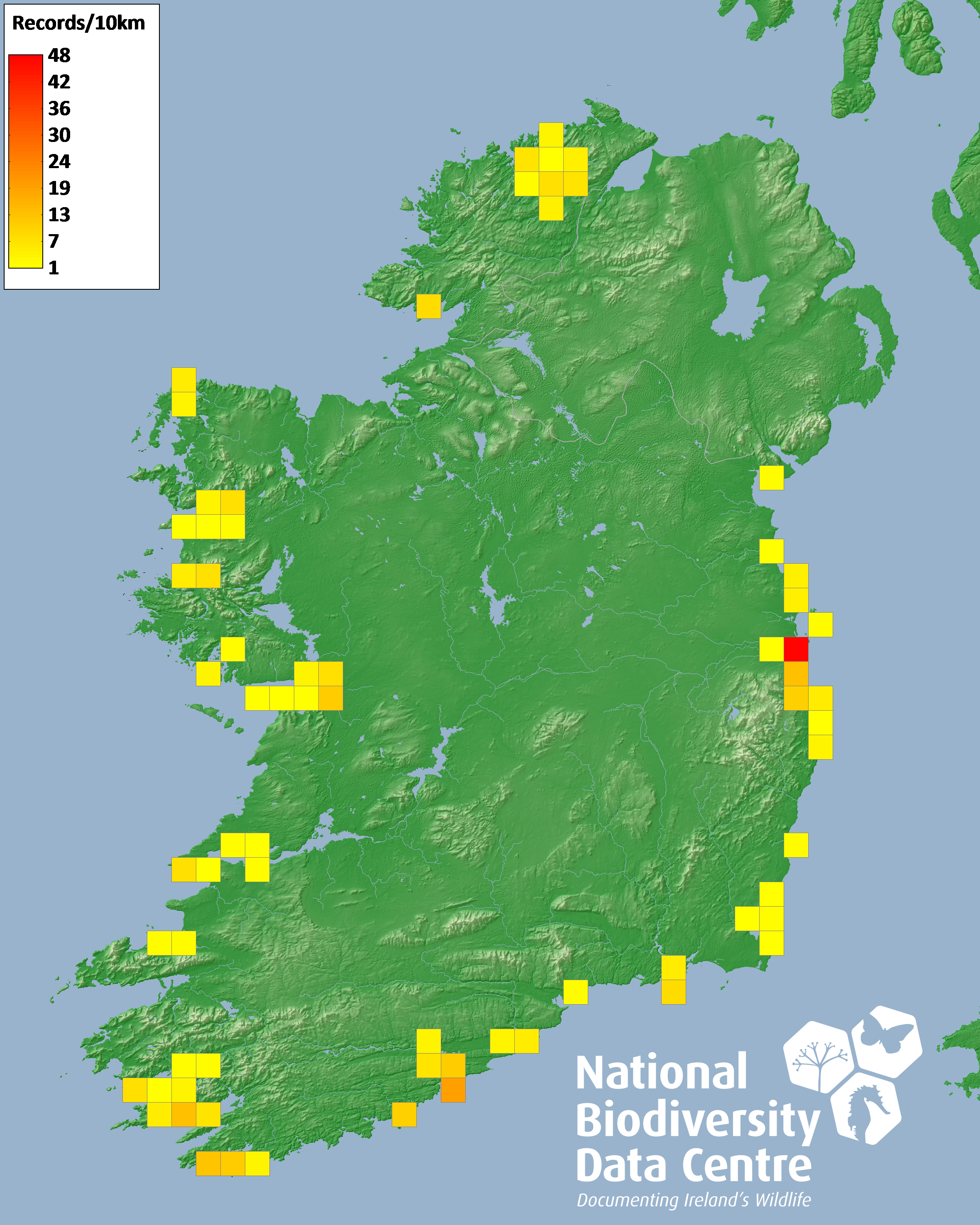 Distribution of the number of records recorded within each 10km grid square (ITM).Marine Map - 50km