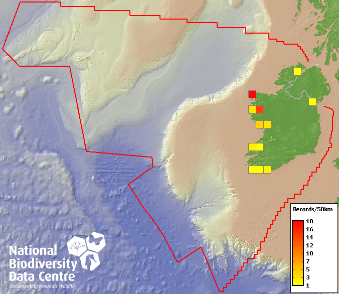 Distribution of the number of records recorded within each 10km grid square (ITM).Marine Map - 50km