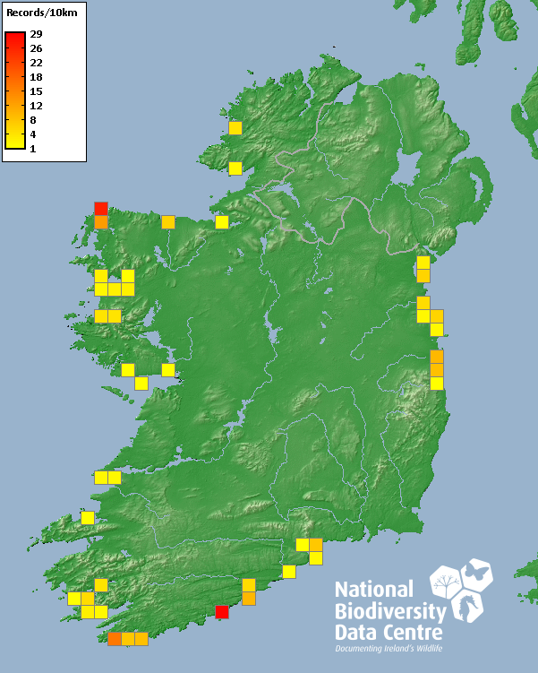 Distribution of the number of records recorded within each 10km grid square (ITM).Marine Map - 50km