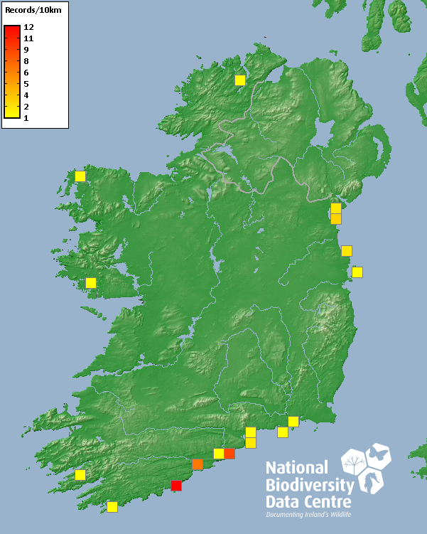 Distribution of the number of records recorded within each 10km grid square (ITM).Marine Map - 50km