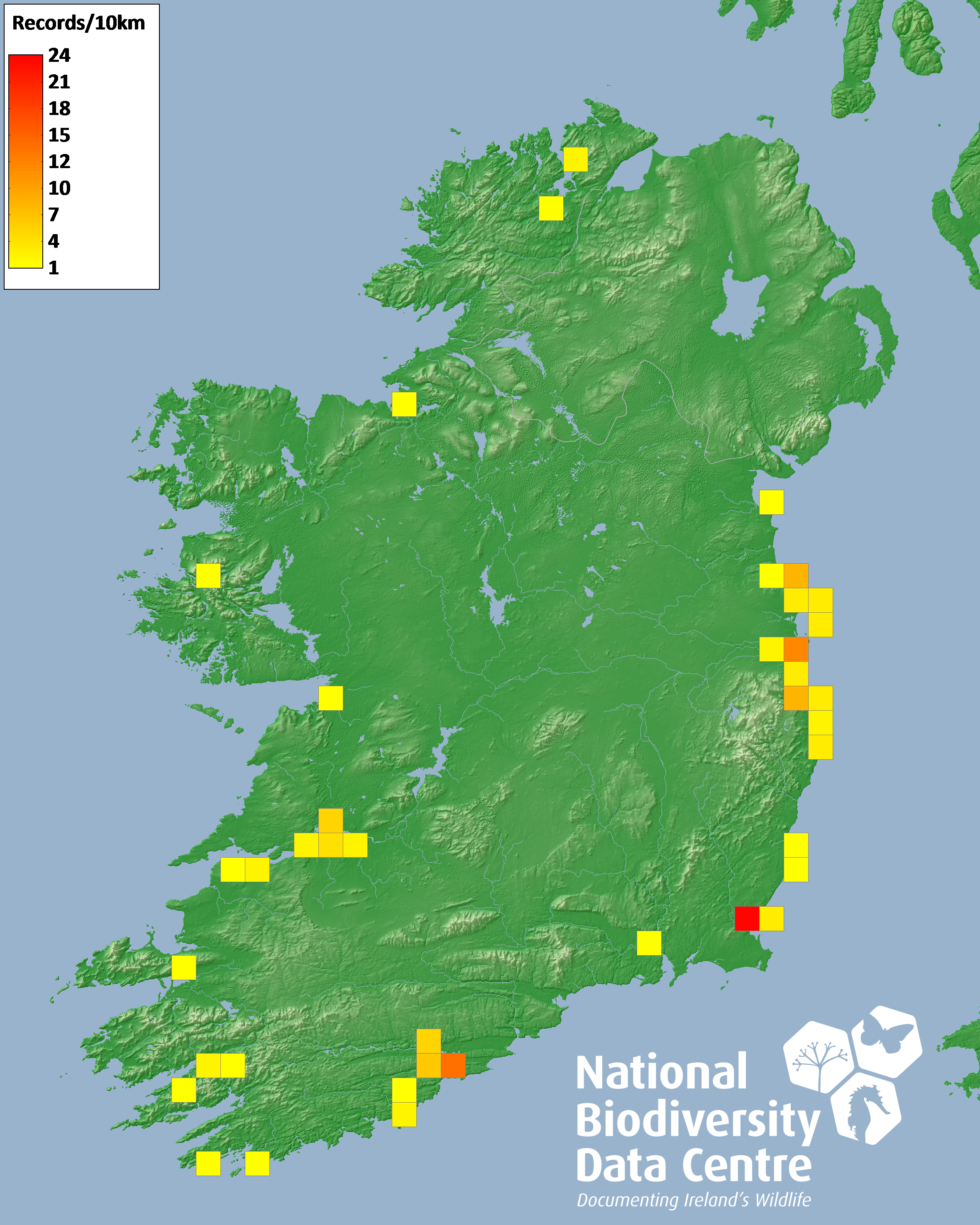 Distribution of the number of records recorded within each 10km grid square (ITM).Marine Map - 50km