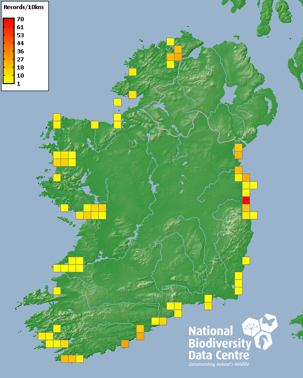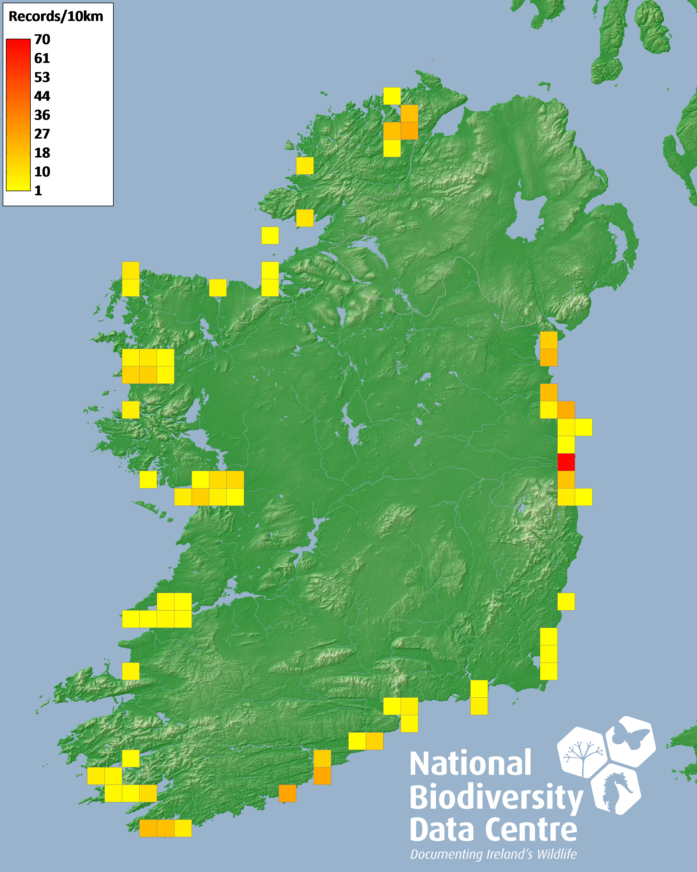 Distribution of the number of records recorded within each 10km grid square (ITM).Marine Map - 50km