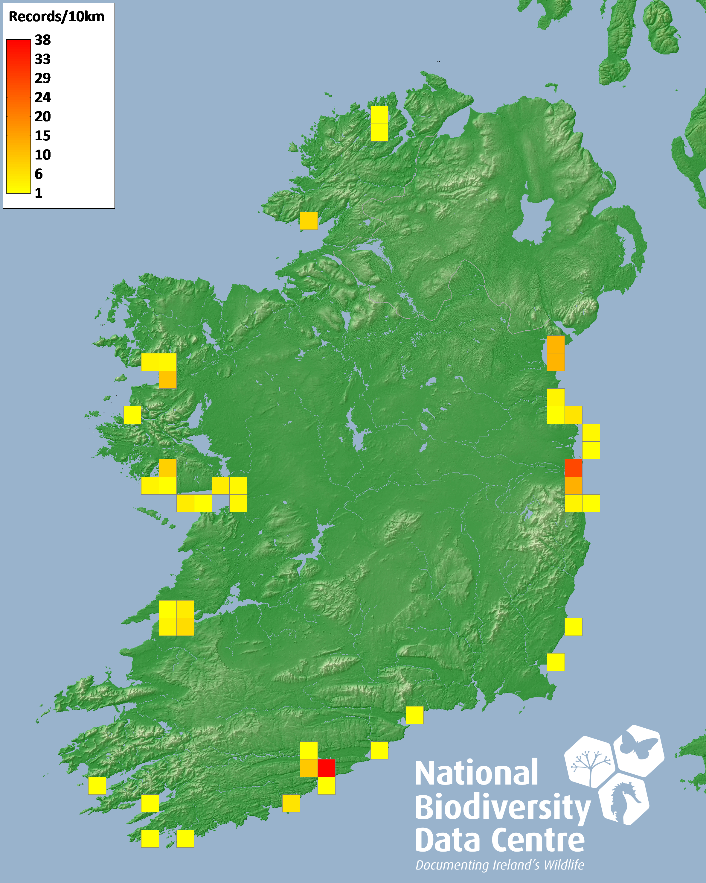 Distribution of the number of records recorded within each 10km grid square (ITM).Marine Map - 50km