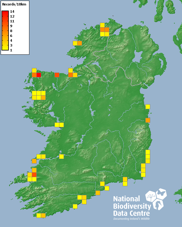 Distribution of the number of records recorded within each 10km grid square (ITM).Marine Map - 50km