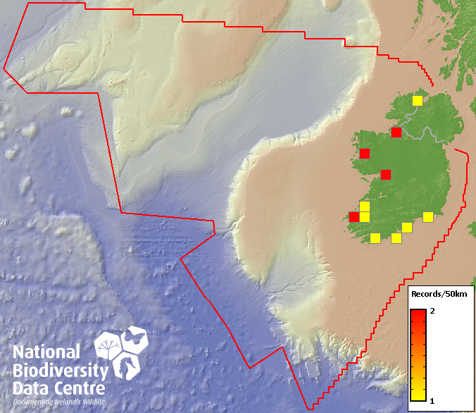 Distribution of the number of records recorded within each 10km grid square (ITM).Marine Map - 50km