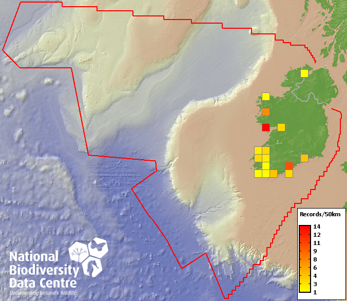 Distribution of the number of records recorded within each 10km grid square (ITM).Marine Map - 50km