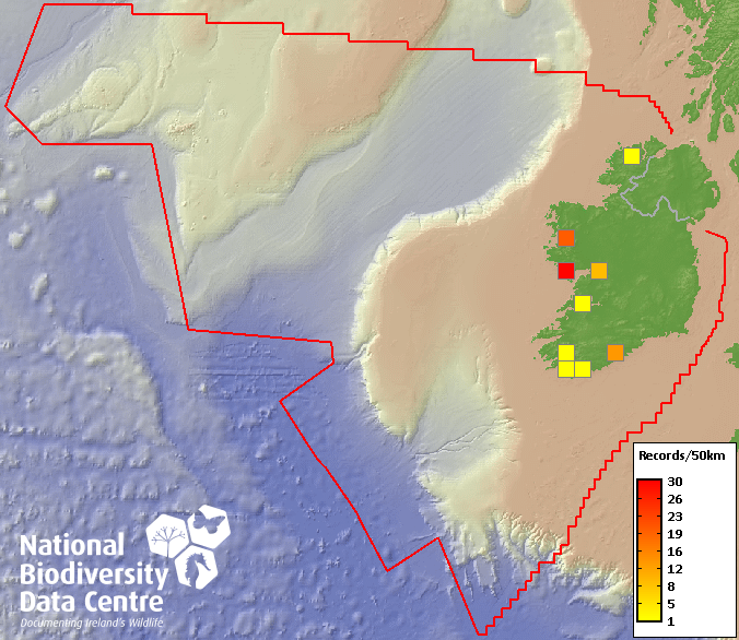 Distribution of the number of records recorded within each 10km grid square (ITM).Marine Map - 50km
