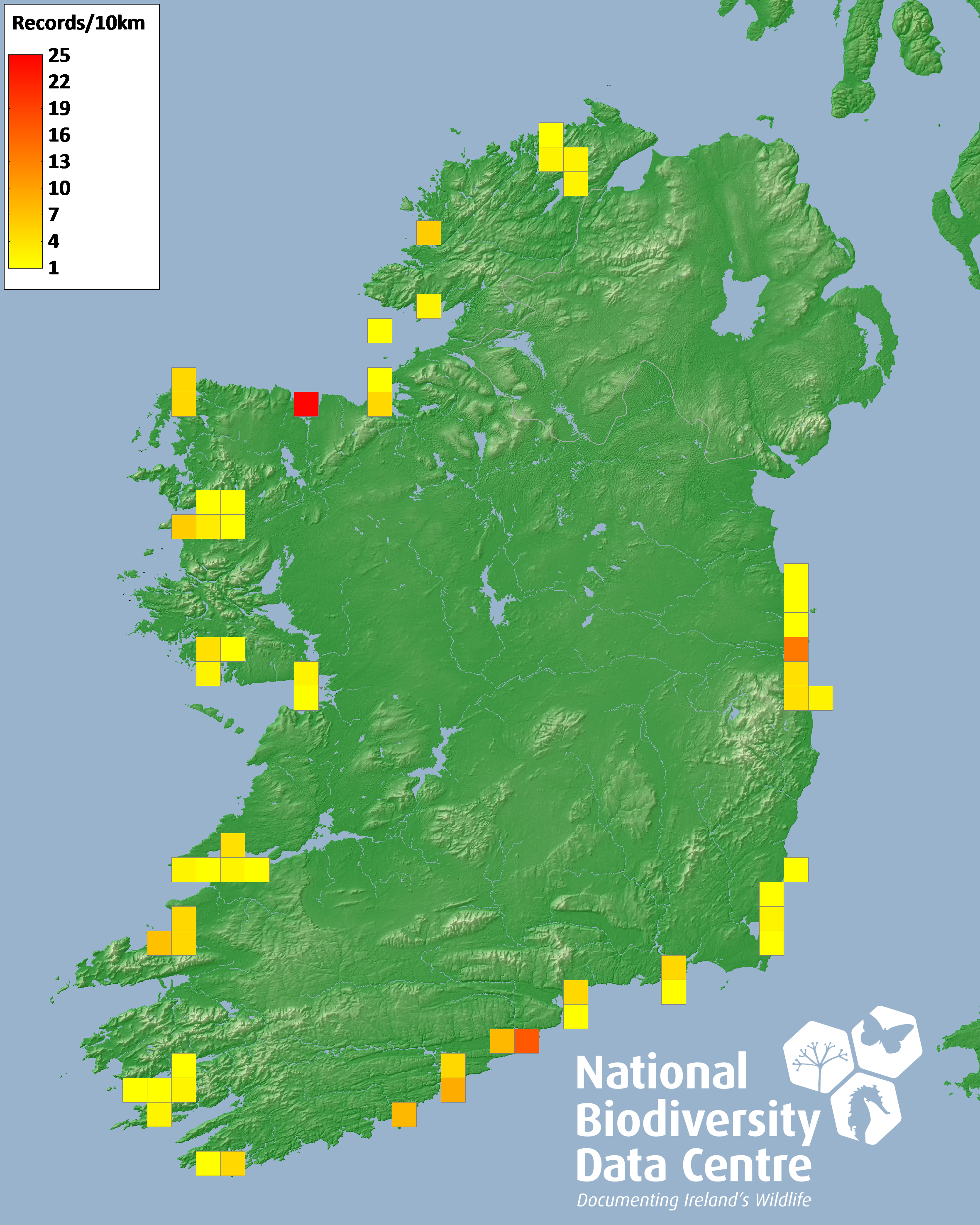 Distribution of the number of records recorded within each 10km grid square (ITM).Marine Map - 50km