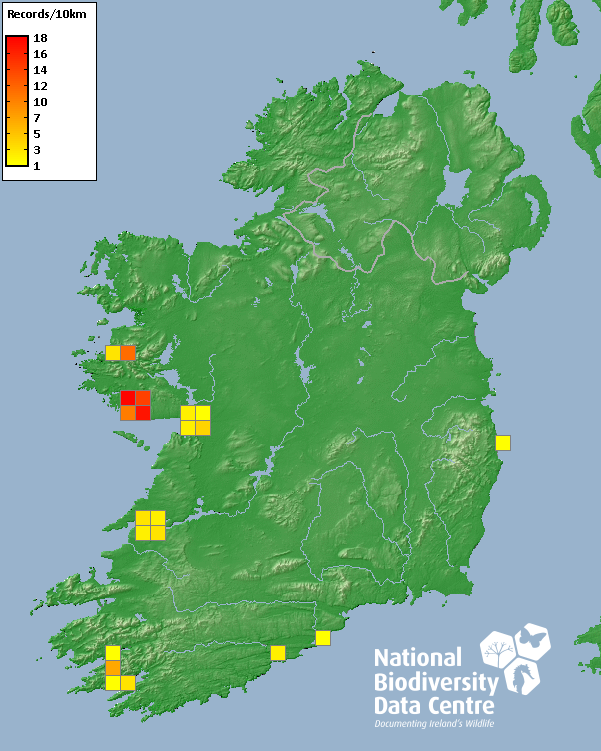 Distribution of the number of records recorded within each 10km grid square (ITM).Marine Map - 50km