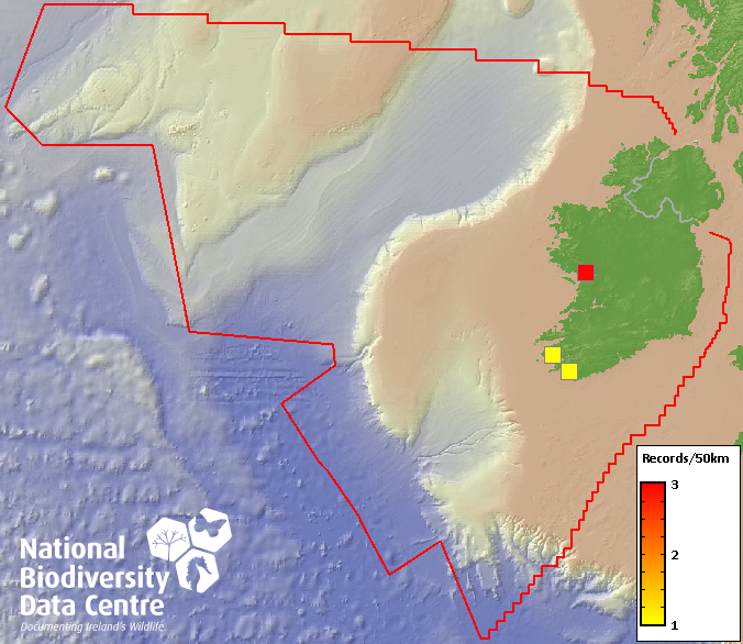 Distribution of the number of records recorded within each 10km grid square (ITM).Marine Map - 50km