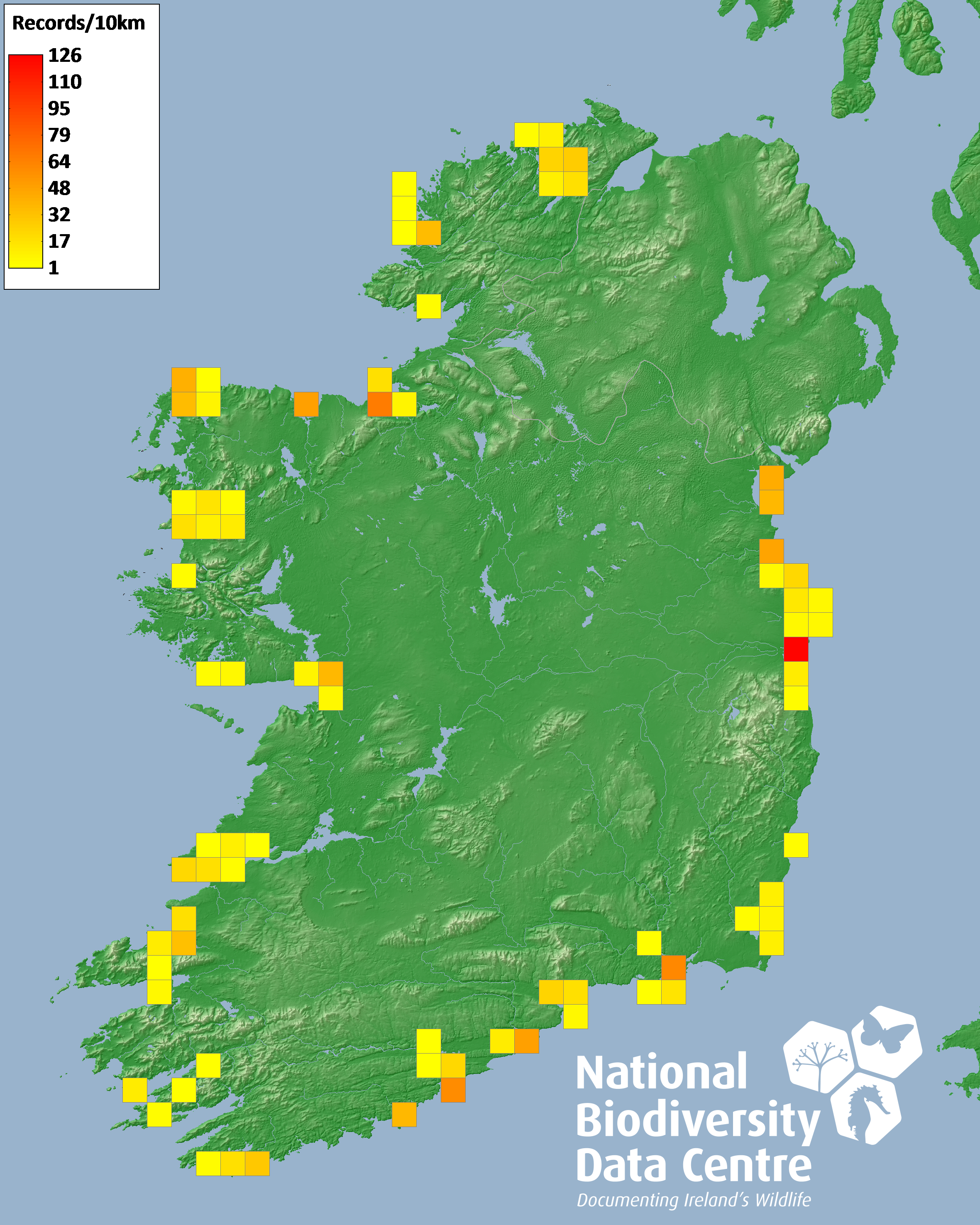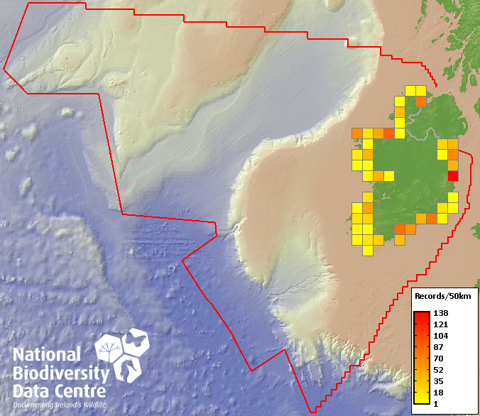 Distribution of the number of records recorded within each 10km grid square (ITM).Marine Map - 50km