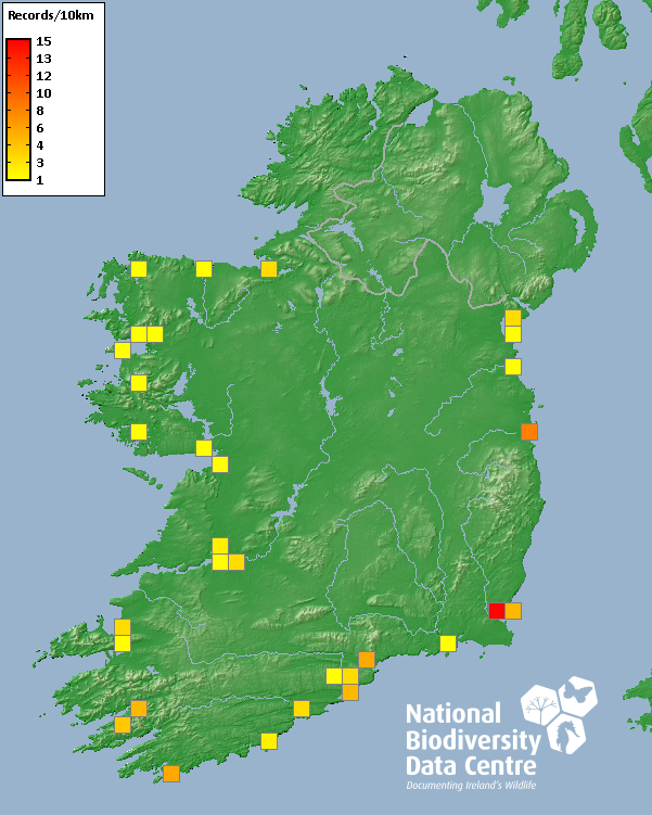 Distribution of the number of records recorded within each 10km grid square (ITM).Marine Map - 50km