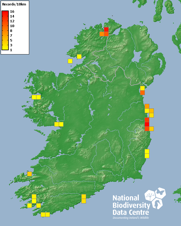 Distribution of the number of records recorded within each 10km grid square (ITM).Marine Map - 50km