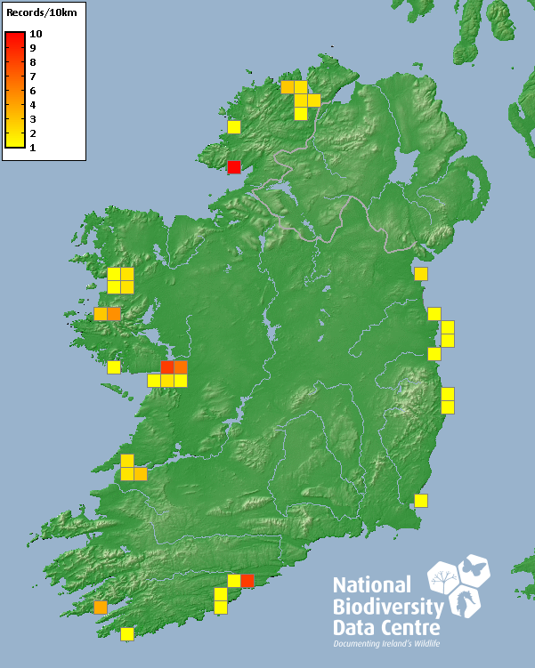 Distribution of the number of records recorded within each 10km grid square (ITM).Marine Map - 50km